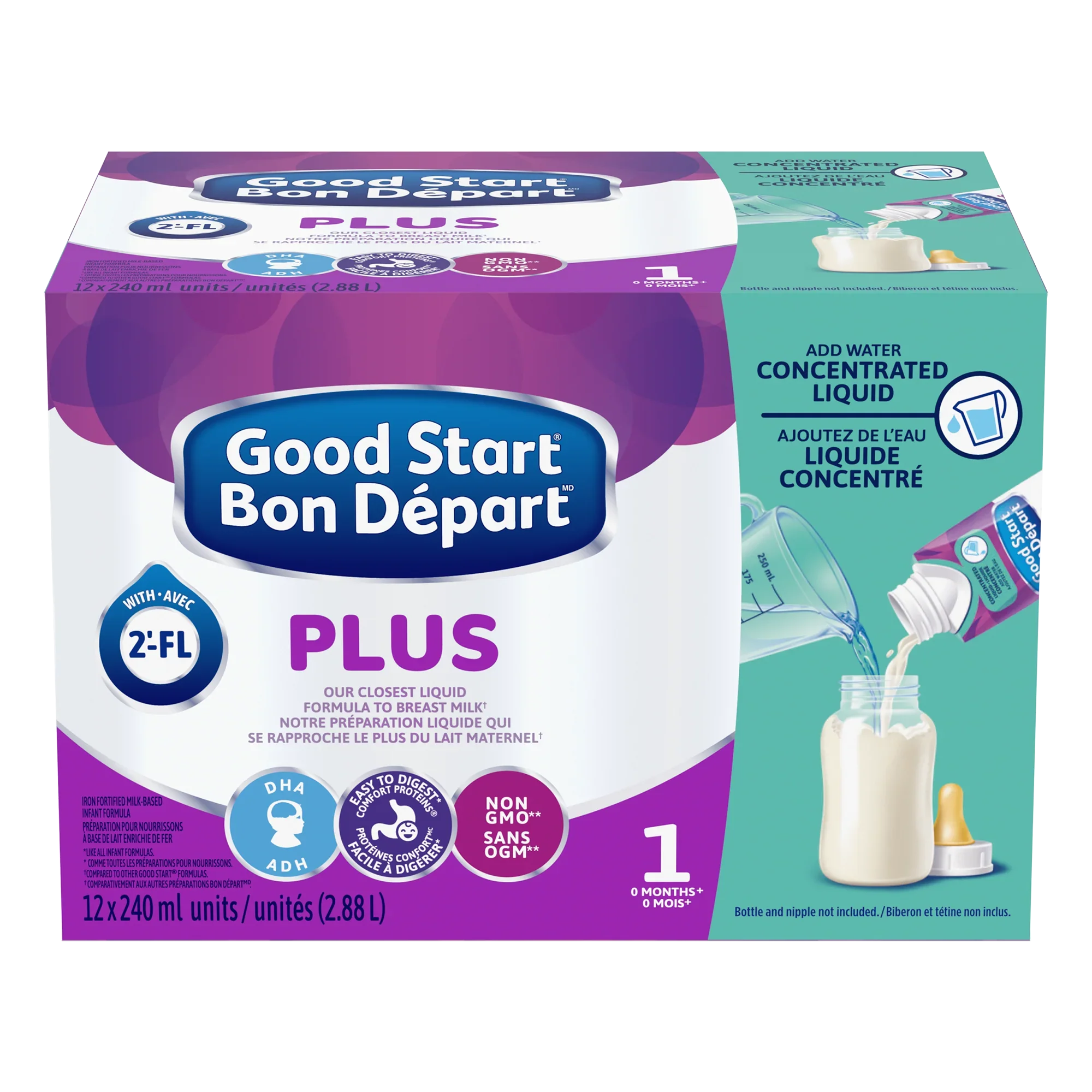Our closest liquid formula to breast milk with the combination of Comfort Proteins ® , DHA, and 2’-FL. Mixes easily with no clumps or scoops – just add water as directed and shake well. For infants 0 to 12 months Our closest liquid formula to breast milk Good Start ® is Pediatricians' #1 choice for easiest formula on baby's tummy!* Tummy friendly and easy to digest†, only Good Start ® formulas contain Comfort Proteins ® , which are 100% whey proteins that are partially broken down for small tummies – and they have been scientifically shown to help promote softer poop §,1 Expert recommended levels of DHA 2 , an Omega 3 fat, which contributes to your baby’s normal physical brain and eye development With 2’-FL. 2’-FL is an oligosaccharide found in breast milk ǁ that is shown to help support digestive health and the developing immune system 3-5 Non-GMO ǂ Comes in an easy-to-use Concentrated Liquid format with a reclosable cap, that mixes easily with no clumps or scoops - just add water as directed and shake well.