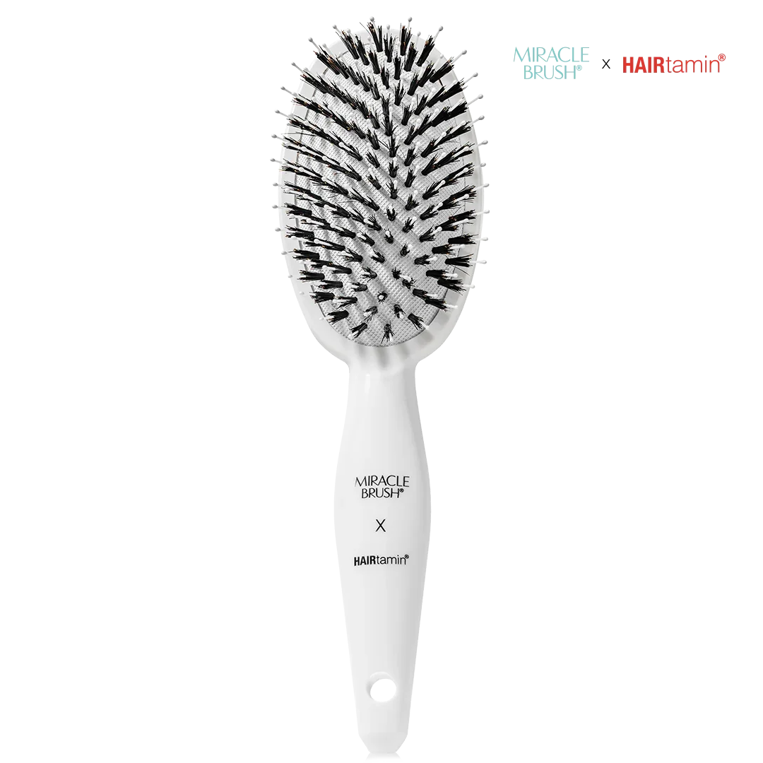 The collab we've all been waiting for. The Miracle Brush® for HAIRtamin ® is a world-famous, state-of-the-art, paddle brush with precision dual boar/nylon bristles and microsphere massaging tips. This sleek, ergonomically-designed brush gently yet effectively detangles hair of all textures and lengths while simultaneously encouraging volume, shine, and scalp micro-circulation for healthy hair growth. After 1 use, you’ll wonder how you ever lived without it! Anti-static Dual bristle technology Microsphere tips Light weight Sleek, ergonomic design Scalp-stimulating Volume-boosting Shine-enhancing Gentle & effective detangling Anti-breakage For all hair types, textures, and lengths Suitable for women, men, children, even pets