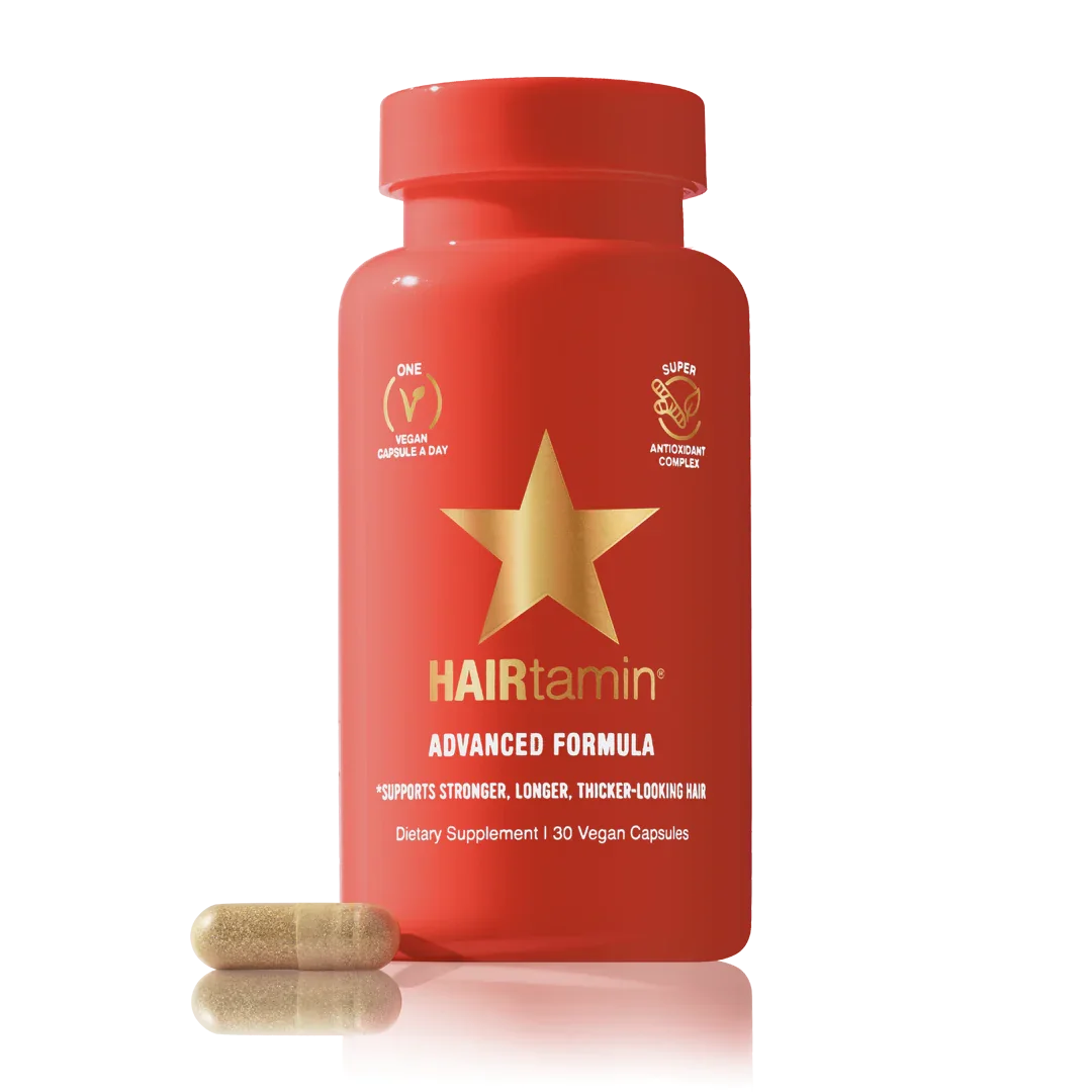 HAIRtamin® Advanced Formula is a physician-formulated, clean, one-a-day, hair nourishing supplement with clinically-studied, vegan ingredients that can help maintain stronger, longer, thicker-looking hair. Our proprietary blend of essential hair-loving vitamins, minerals and herbs, plus a potent super antioxidant complex, synergistically work together to help maintain healthy hair growth, retention and follicle strength from the inside out. Suggested Use: Take one capsule daily or as directed by a health care professional. Either swallow the capsule whole with water, or twist the capsule, pull it apart and sprinkle the contents on food or in a drink of your choice. Clinical Strength 5000 mcg Biotin Super Antioxidant Complex with Turmeric, Black Pepper Seed, Cayenne, Aloe Vera Horsetail Extract Rosemary Stinging Nettle Bacopa Monnieri Leaf Extract Vitamin A, C, D3, B1, B2, B3, B5, B6, B12 Niacinimide Folic Acid Zinc Selenium Clean, effective, just 1 a day Helps promote stronger, longer, thicker-looking hair Helps fight hair shedding & thinning May help improve follicle strength Can help promote healthy scalp for optimal growth Can help improve nail & skin health Formulated for both women & men For all hair types / textures + all ethnicities