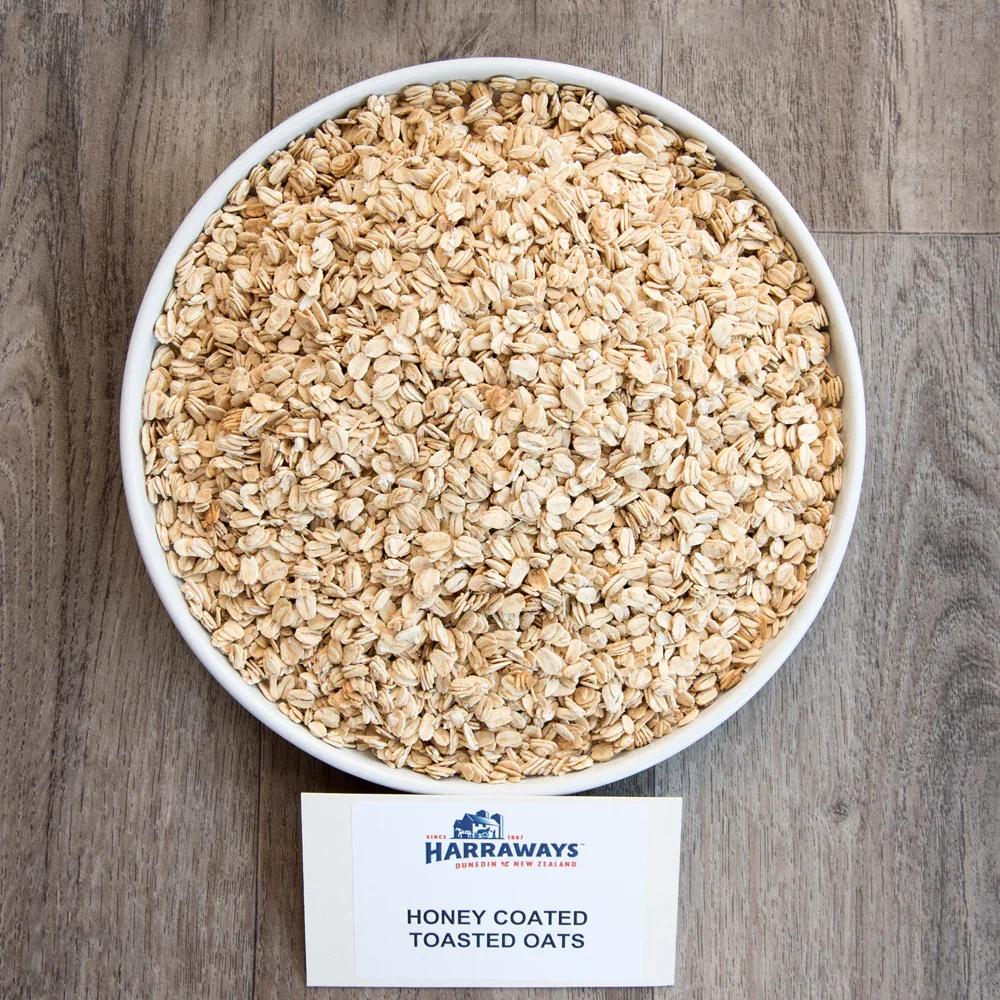 Australian Oats. Honey Coated Toasted oats are produced from rolling the whole oat groat which is then lightly toasted and coated with honey and brown sugar. Product Code: F0047 This product is a business-to-business, commercially transacted product and is not available generally to consumers in smaller quantities or for one off transactions.