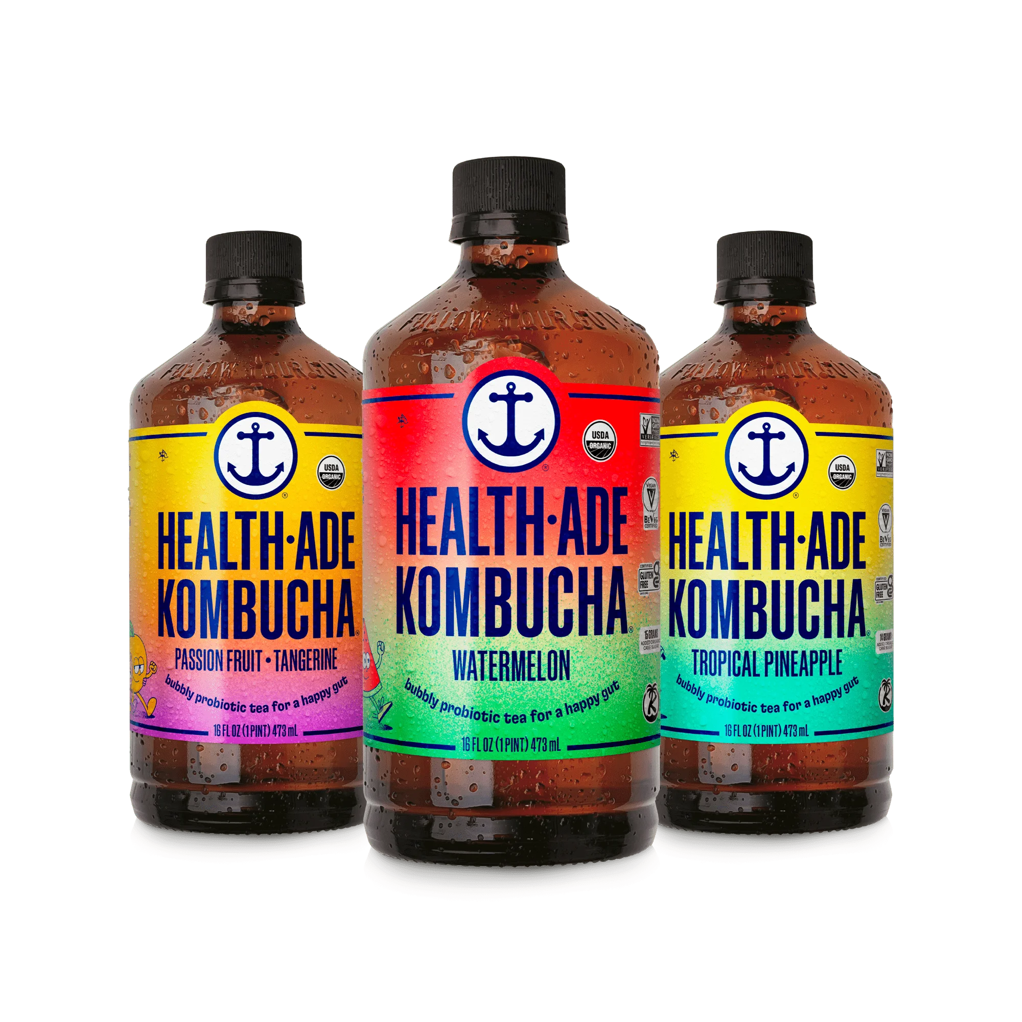 Passionfruit-Tangerine, Tropical Pineapple and Pomegranate Blueberry kombucha, 12-pack contains four 16 oz. bottles of each flavor. Please note: You may receive our current or updated flavor variety as we transition to a new flavor pack.