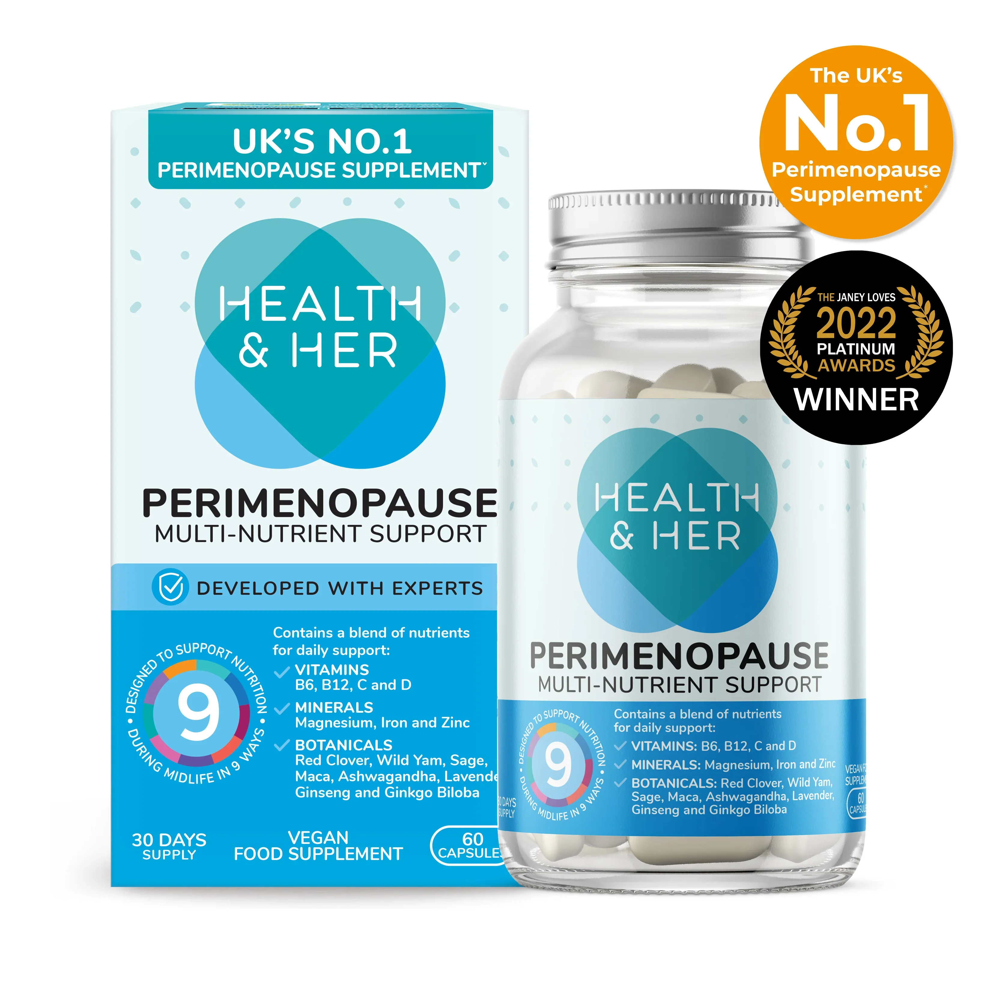 Formulated by experts, Health & Her Perimenopause Multi-Nutrient Support & UK's No.1 Perimenopause supplement* contains a blend of vitamins, minerals and botanicals including Red Clover, Sage, Ashwaghanda and Wild Yam. Our Perimenopause formula is now also available in a gummy version Designed to support nutrition during midlife in 9 ways: Vitamin B6 contributes to the regulation of hormonal activity. Vitamins B6, C, and Magnesium contribute to the reduction of tiredness and fatigue and support a normal energy-yielding metabolism. Vitamins B6, B12, C, and magnesium contribute to the normal psychological function. Iron contributes to normal cognitive function. Magnesium contributes to the maintenance of normal muscle function. Vitamin C contributes to normal collagen formation for the normal function of bones and cartilage. Vitamin C contributes to normal collagen formation for the normal function of skin and Zinc contributes to the maintenance of normal skin, hair, and nails. Zinc contributes to the maintenance of normal testosterone levels in the blood. Iron, Zinc, Vitamin B12 & Vitamin C contribute to the normal function of the immune system. Includes botanicals, Red Clover, Ashwagandha, Sage and Wild Yam. ##NO1CLAIMCITE##