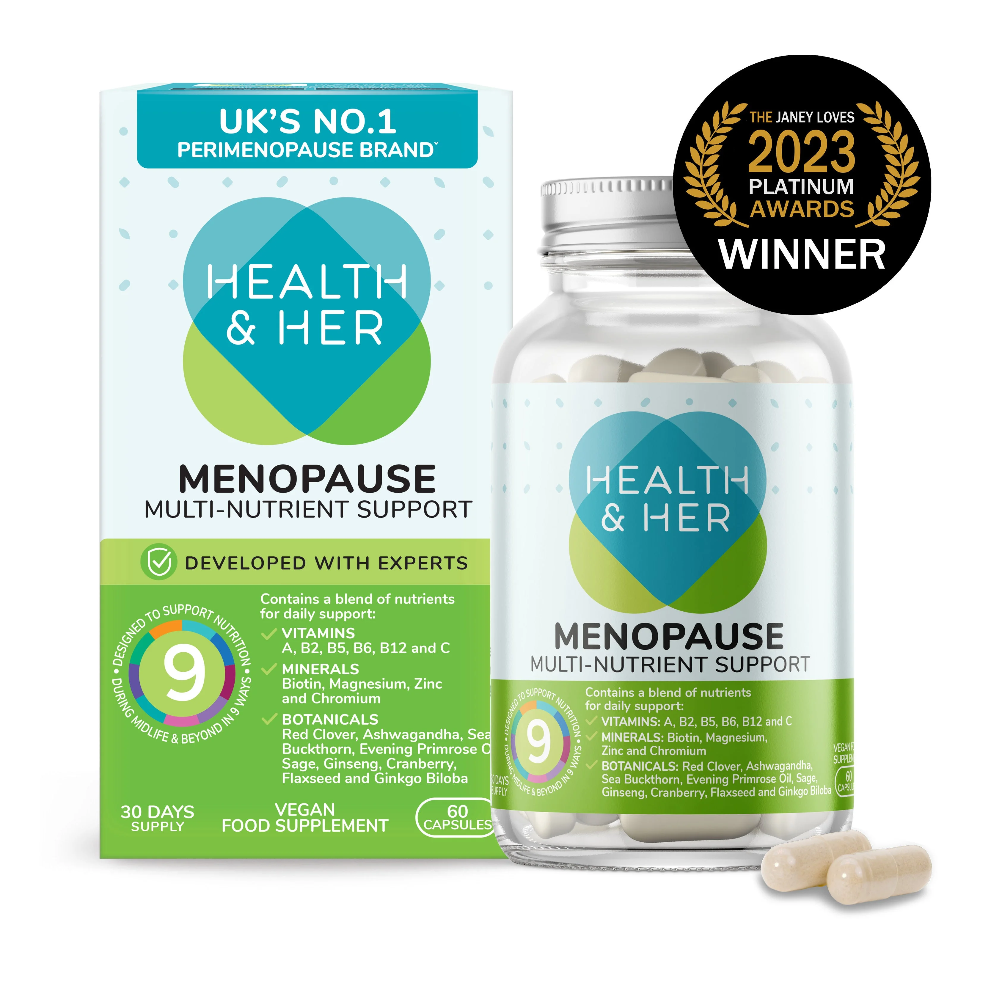 Formulated by experts , Health & Her Menopause Multi-Nutrient Support contains a blend of vitamins, minerals and botanicals including Red Clover, Evening Primrose Oil, Ashwagandha, Sage and Flaxseed Designed to support nutrition and wellbeing during menopause in 9 ways: Vitamin B6 contributes to the regulation of hormonal activity Vitamins B6, C, and Magnesium contribute to the reduction of tiredness and fatigue Vitamins B6, B12, C, Biotin, and Magnesium contribute to the normal psychological function Zinc contributes to normal cognitive function Vitamin C contributes to normal collagen formation for the normal function of skin, and Zinc contributes to the maintenance of normal skin, hair, and nails Zinc contributes to the maintenance of normal testosterone levels in the blood. Vitamin C contributes to normal collagen formation for the normal function of bones and cartilage, which forms part of your joints. Chromium contributes to the maintenance of normal blood glucose levels Vitamins B6, B12, C and Zinc contribute to the normal function of the immune system Includes botanicals Red Clover, Evening Primrose Oil, Ashwagandha, Sage and Flaxseed.