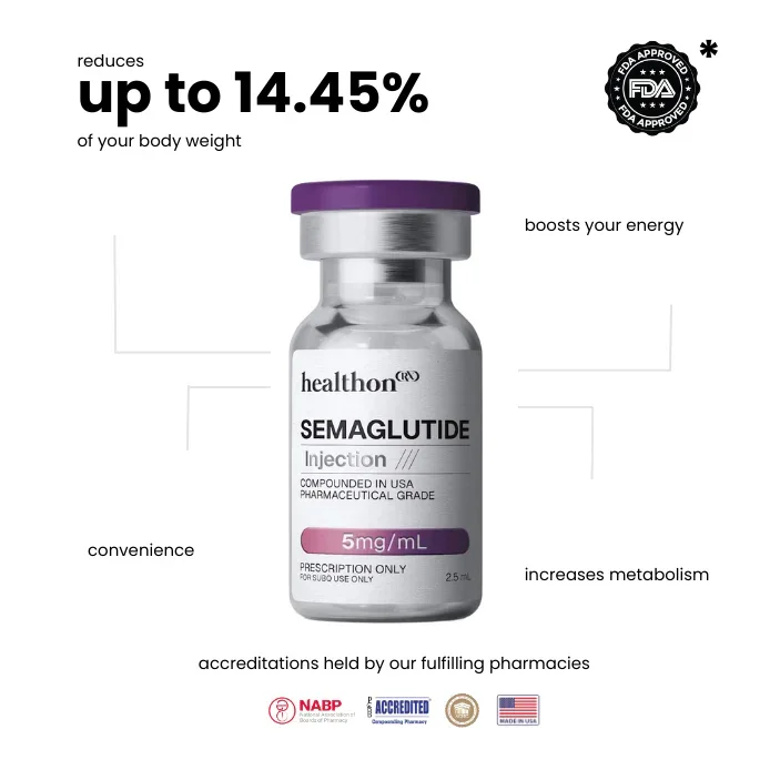 Work with licensed providers to see if a GLP-1 treatment option may be appropriate for your health goals. Lose up to 15% of your bodyweight with expert medical guidance for safe, effective, and long-term results.. Contains a GLP-1 receptor agonist used in weight management Expert Medical Support with personalized treatment plans No insurance required Ships free in 1-2 days All-Inclusive pricing , no hidden fees What is Compounded Semaglutide? Compounded semaglutide is a customized medication prepared by licensed compounding pharmacies when FDA-approved treatments are not suitable for an individual patient. It belongs to a class of GLP-1 receptor agonists, which may support medical weight management by influencing appetite, digestion, and blood sugar regulation. Who is Compounded Semaglutide For? Compounded semaglutide may be considered for adults with a BMI of 30 or higher, or 27+ with weight-related health conditions such as high blood pressure or type 2 diabetes. It is prescribed based on medical necessity and individualized care, when a customized dosing plan is needed to improve tolerability or support gradual titration under provider supervision. Is Compounded Semaglutide Safe? Compounded semaglutide may be prescribed by licensed providers and dispensed by state-licensed compounding pharmacies when medically necessary. All medications undergo testing for potency and sterility, but as compounded preparations, they have not been reviewed or approved by the FDA for safety or effectiveness. Why Buy Semaglutide Online from Healthon? Healthon makes accessing high-quality and medically supervised weight loss treatment simple and secure. Our compounded semaglutide is sourced from FDA-registered pharmacies, shipped discreetly with fast turnaround, and supported by our 24/7 Care 360 system.
