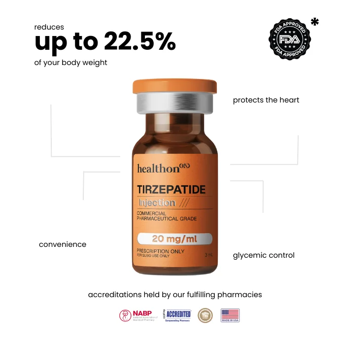 Work with licensed providers to see if a GLP-1 treatment option may be appropriate for your health goals. Lose up to 20% of your bodyweight supported by personalized medical care for safe, effective, and sustainable results. Contains a GLP-1 receptor agonist used in weight management Expert Medical Support with personalized weight loss plans No insurance required Ships free in 1-2 days All-Inclusive pricing , no hidden fees What is Tirzepatide? Tirzepatide is a GLP-1/GIP receptor agonist that has been studied in FDA-approved medications such as Mounjaro®. It affects pathways related to appetite and glucose regulation. Healthon may offer compounded tirzepatide prepared by U.S.-licensed compounding pharmacies when a licensed provider determines that such a formulation is clinically appropriate for an individual patient’s needs. Compounded tirzepatide is not reviewed or approved by the FDA for safety or effectiveness. How Does Tirzepatide Work? Tirzepatide influences pathways related to appetite and glucose regulation. Clinical trials of FDA-approved tirzepatide products have shown weight-related effects in some participants when used alongside diet and lifestyle changes. Individual responses vary, and compounded tirzepatide has not been reviewed or approved by the FDA for safety or effectiveness. Who May Be Considered for Tirzepatide ? Eligibility is determined by a licensed provider following a medical consultation. Clinical guidelines for FDA-approved GLP-1/GIP therapies generally include adults with obesity (BMI ≥30) or overweight (BMI ≥27) with weight-related conditions such as type 2 diabetes or high blood pressure. Providers assess each patient individually to decide whether compounded tirzepatide is an appropriate option. Why Choose Healthon for Tirzepatide? Healthon connects patients with U.S.-licensed providers who evaluate treatment options and determine if compounded GLP-1/GIP medications are appropriate. Prescriptions, if issued, are filled by licensed compounding pharmacies that may perform third-party quality testing. Medications are shipped directly to patients with transparent pricing and ongoing provider support. Note: Compounded medications are not FDA-approved.