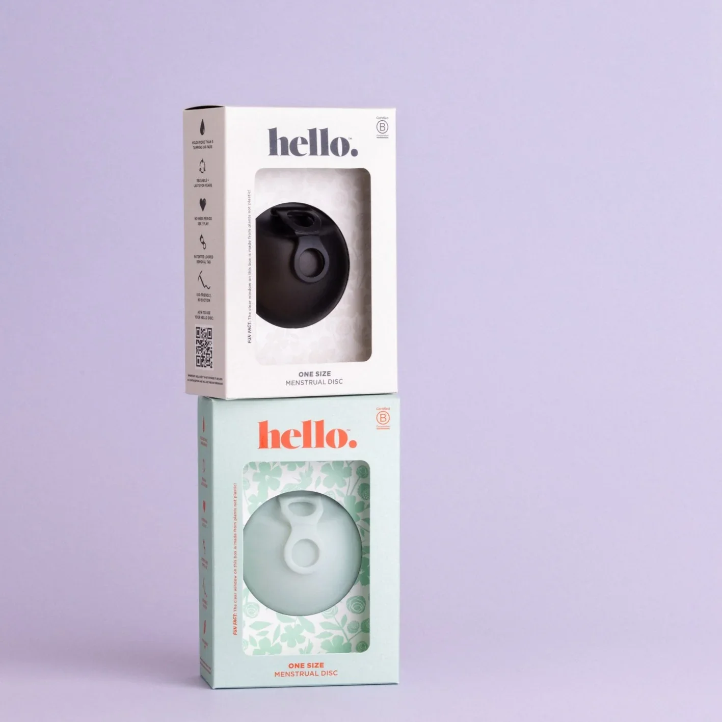 Say ‘hello’ to the world’s most innovative, comfortable and easy-to-remove menstrual disc ! The Hello Disc features a double-looped tab for easy removal. Say ‘goodbye’ to fishing around for your period disc - and ‘hello’ to a true period game-changer. The Hello Disc is available in Barbie's dream disc Bubblegum, goth-chic Black or serene Sea Fog. Made from 100% premium medical-grade silicone, the Hello Disc will provide hours of leak-proof protection and holds 50mls without the bulk of traditional period products . Plus, it’s reusable, making it an eco-friendly choice. Organic cotton storage bag sold separately. Co-designed by world-renowned menstrual cup and disc expert, Kim Rosas, and a Registered Nurse A handy ‘one size fits most’* Choose from four ways to wear Suits all cervix heights Wear with an IUD Wear during penetrative intercourse for no-mess period sex Capacity: 50ml Diameter: 68mm Looped tab length: 48mm WINNER: Best Product Design - Good Design Awards 2022 WINNER (Silver): NZ Best Awards 2022 - Consumer WINNER (Silver): NZ Best Awards 2022 - Sustainable Product Design FINALIST: NZ Best Awards 2022 - Value of Design If you have a retroflex uterus or really low cervix, take a look at our FAQ Page for more information 💗 Not ready to switch just yet? No worries! Check out our ultra-thin and super absorbent reusable pads for reliable protection. Hello Discs are responsibly made in China.