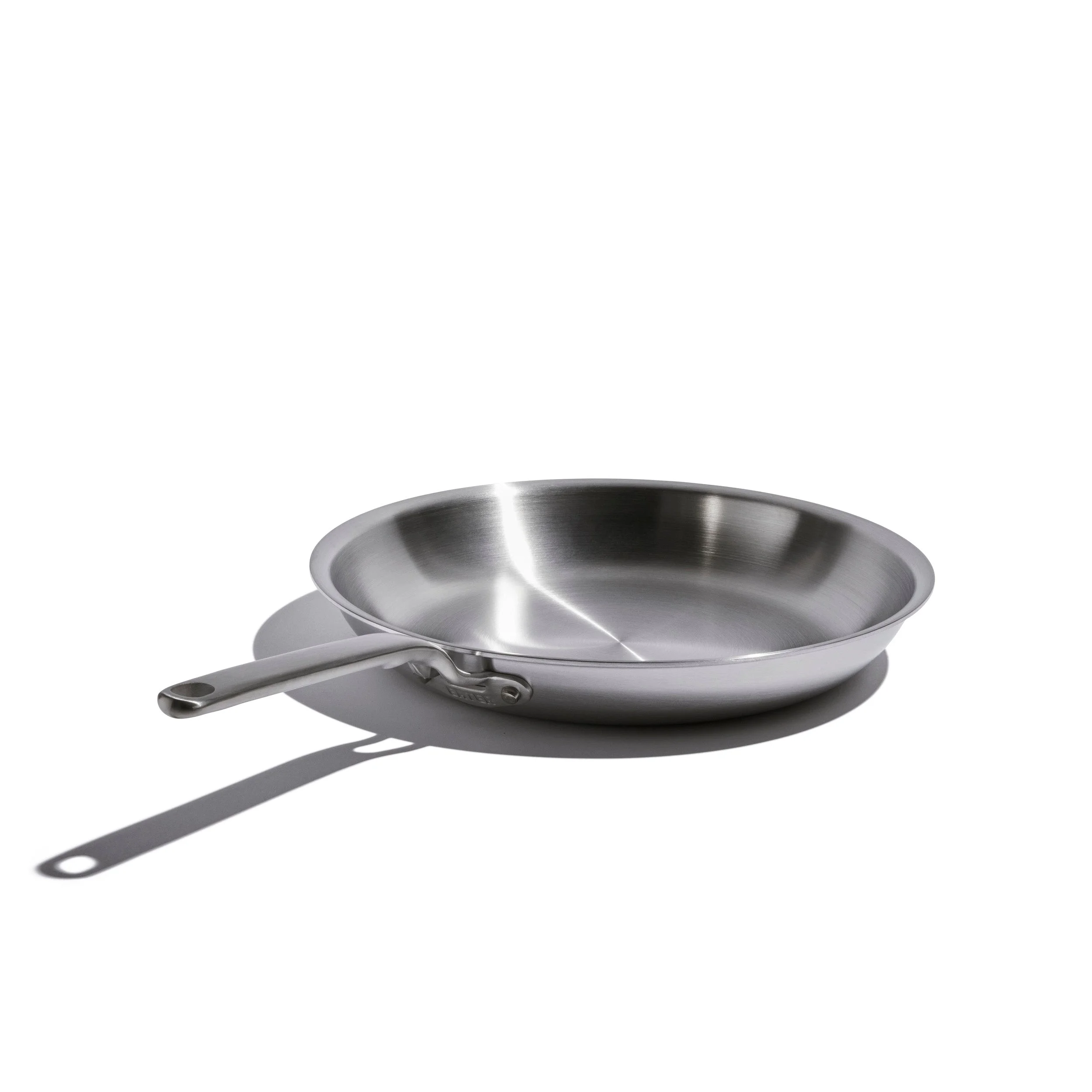 This fry pan's large size provides ample cooking space, plus fully clad stainless steel distributes heat evenly across all surfaces. The thick metal body is durable and retains heat for an excellent sear.