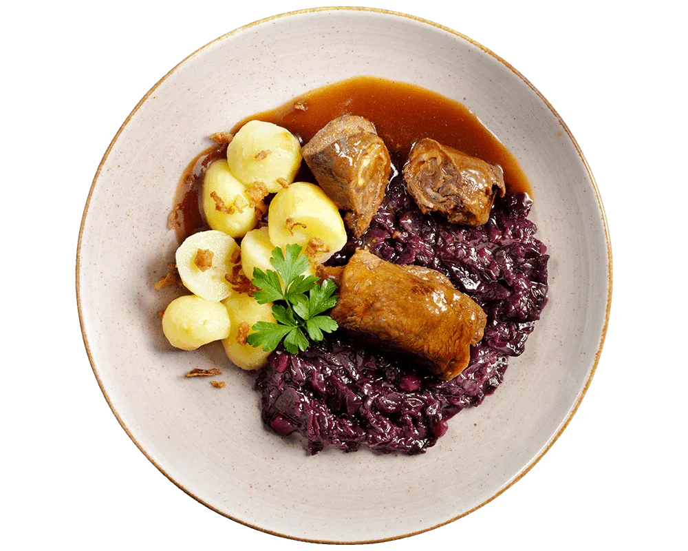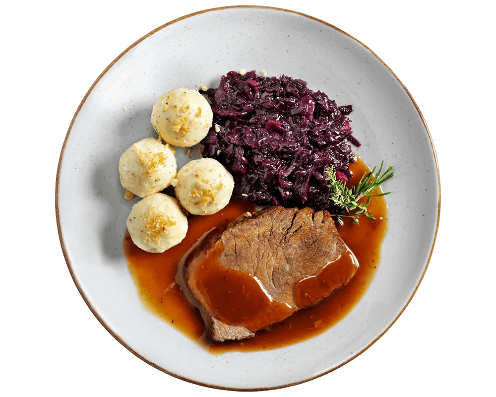 In unserer hauseigenen Metzgerei nach bewährter Tradition zubereitet, präsentieren wir stolz unseren unverkennbaren, zarten Sauerbraten. Dieses herzhafte Gericht gilt als wahrer Klassiker und kulinarisches Highlight, das Du Dir nicht entgehen lassen solltest. Nichts passt so gut zu einem traditionell zubereiteten Sauerbraten wie fruchtiger Apfelrotkohl , der eine süß-saure Note in das Gericht bringt. Die deftigen Kartoffelklöße mit knusprigen Semmelbröseln vervollständigen diese hochwertige Tiefkühlmahlzeit, die sowohl zu Feiertagen als auch nach einem langen Arbeitstag einfach ausgezeichnet schmeckt.