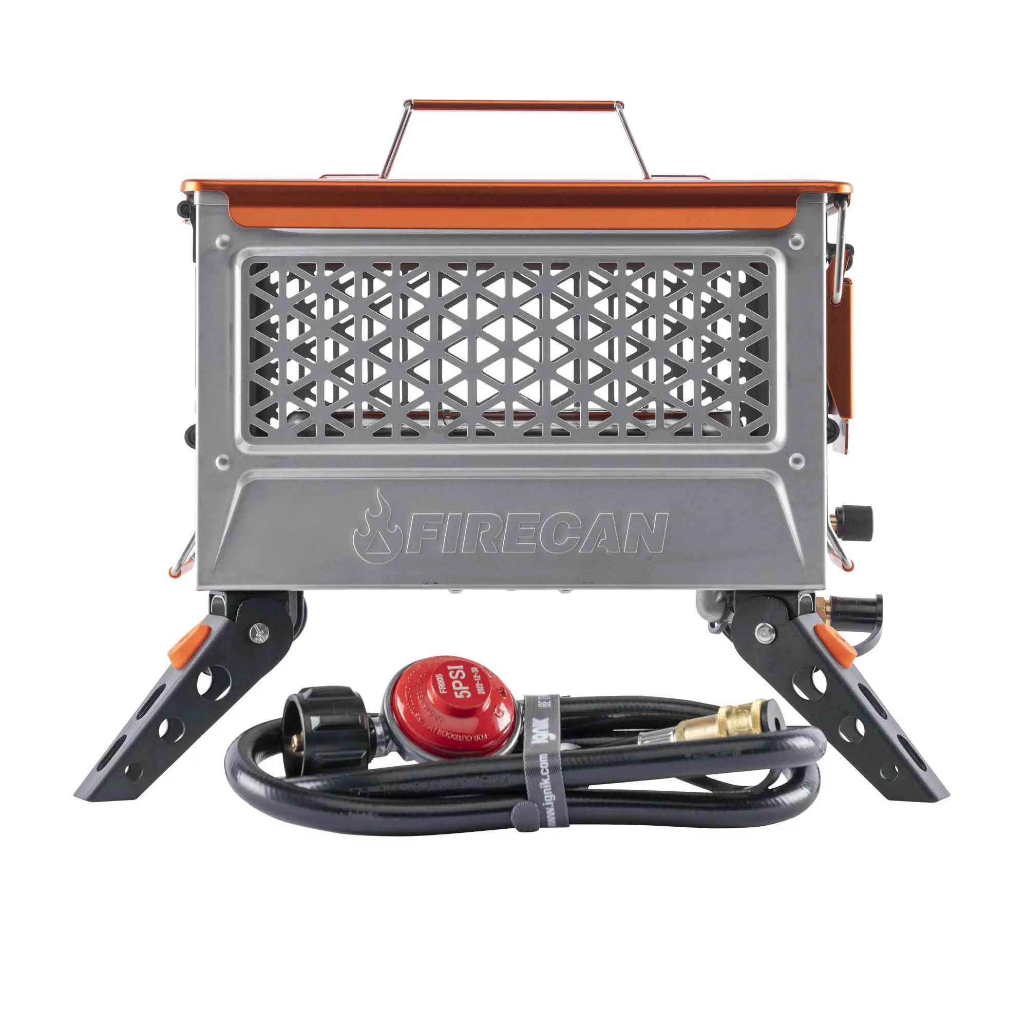 *WE ARE SORRY, BUT THE FIRECAN IS NOT AVAILABLE TO SHIP OUTSIDE THE USA An absolute workhorse, and the best flame for your buck. The FireCan OG’s bomber powder-coated black steel frame holds up through any adventure, cranking out 37,000 BTUs of blazing heat. BURN BAN PARTY PLAN - No Smoke, No Wood, No Spark. Raised off the forest floor, providing the perfect alternative to wood fires during the summer burn bans. COMPACT & DURABLE - Tried-and-true ammo can design, powder-coated black steel, stows, and fits anywhere. The collapsible legs and removable lid are easy to set up and quick to break down. SETS UP IN SECONDS - With the quick-release connection, you can have 37,00 BTUs of campfire instantly. MORE HEAT, MORE FLAME - Mesh sides increase visibility and transmission of heat. PLUG AND PLAY - Includes everything you need, all together. Includes FireCan and a 5 ft. hose with an adjustable regulator. * FireCan Fire Rocks or Moon Rocks Highly Recommended