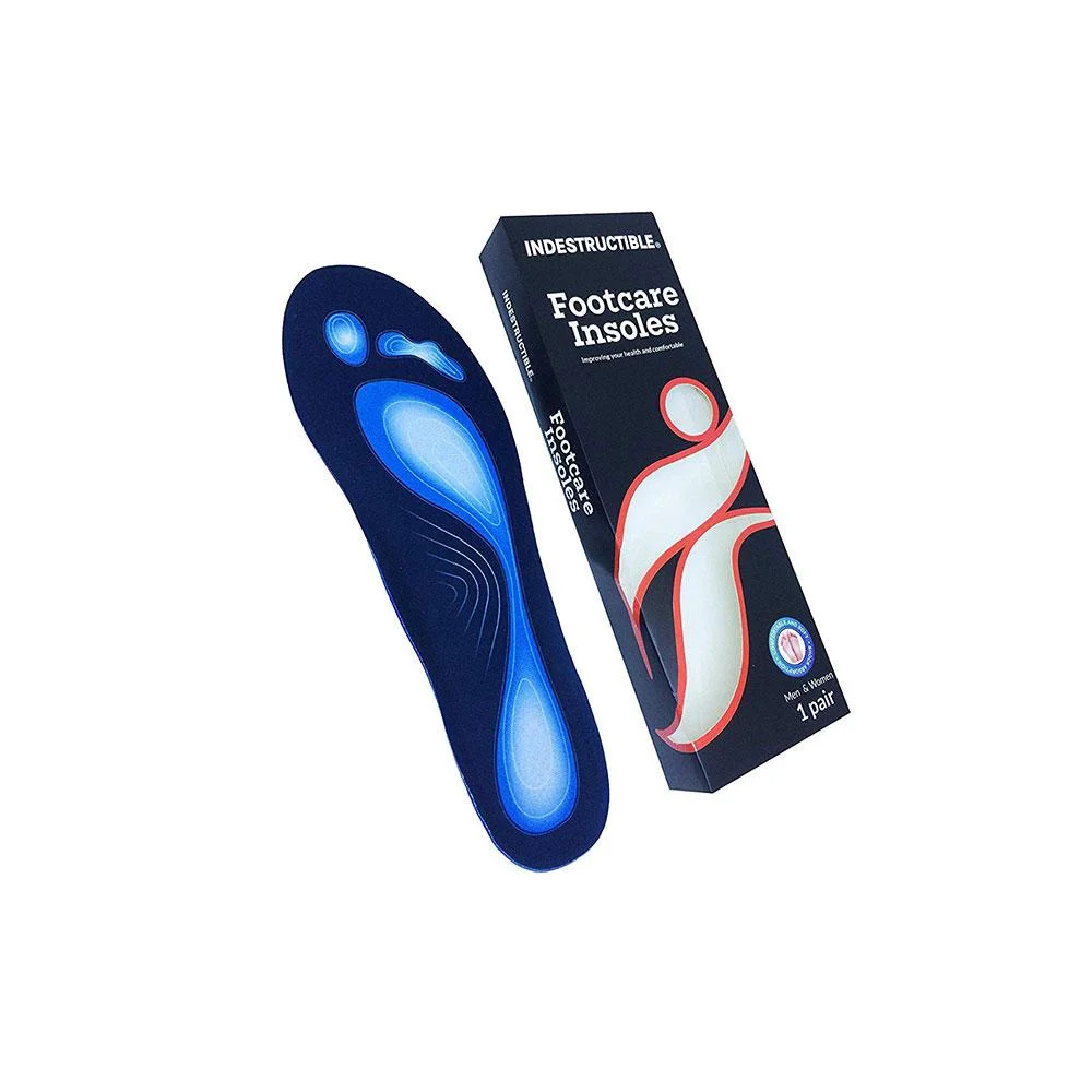 We designed Indestructible Comfort and Energy Work Insoles especially for people who work on hard surfaces all day and experience discomfort and fatigue in their feet and legs. Built with Massaging Gel Technology and extra cushioning to provide all-day shock absorption, they help you stay energized while you work. The package contains one pair of gel insoles to fit men's shoe sizes 8-12. About the product Designed for people who work on hard surfaces all day and experience discomfort and fatigue in their feet and legs Built with Massaging Gel Technology and extra cushioning to provide all-day shock absorption, they help you stay energized while you work Great Arch-Support – Firm columns provide contoured support to overworked arch area Fits Work boots/shoes, Casual shoes & Sneakers. Trim to fit shoe size HOW TO USE Step 1: Your shoes' current insoles are probably removable - take them out first. Step 2: Place insoles into shoes to test for size. Step 3: If needed, trim along the outline (on bottom of insole near the toes) that matches your shoe size. Step 4: Insert your new shock absorbing insole into shoe gel-side down. Replace insoles every six (6) months or at first signs of wear. HOW IT WORKS When you work on your feet all day, the muscles in your feet and legs can become fatigued from supporting your body and from the shock of walking on hard surfaces. This can leave you with tired, achy feet and could slow you down. Indestructible Comfort & Energy Work Insoles provide support and an extra layer of cushioning to absorb shock from working on hard surfaces, which helps reduce muscle fatigue. This helps you feel more energized throughout the day. TIRED, ACHY FEET Anyone can get sore, achy and tired feet. However, it is more likely to occur in people with flat or high-arched feet. It can also occur in people who are overweight, people who work on their feet all day and/or people who are not used to being on their feet who suddenly engage in a higher level of activity. The problem with tired, achy feet is that it keeps you from moving at your best. It can even affect your mood and may lead to more serious foot issues.* *Not a medical diagnosis. For information purposes only. If you have diabetes, poor blood circulation or fragile skin, or symptoms are severe or persistent, consult your podiatrist or physician before using this product. MUSCLE FATIGUE As the name implies, muscle fatigue is the name for a broad condition in which your feet or legs feel sore, achy or just tired. It may not be anything serious, but having muscle fatigue can make it difficult to fully live the busy life you want to live. Muscle fatigue can have a single symptom or several, including swelling, soreness, or a general achiness.* *Not a medical diagnosis. For information purposes only. If you have diabetes, poor blood circulation or fragile skin, or symptoms are severe or persistent, consult your podiatrist or physician before using this product.