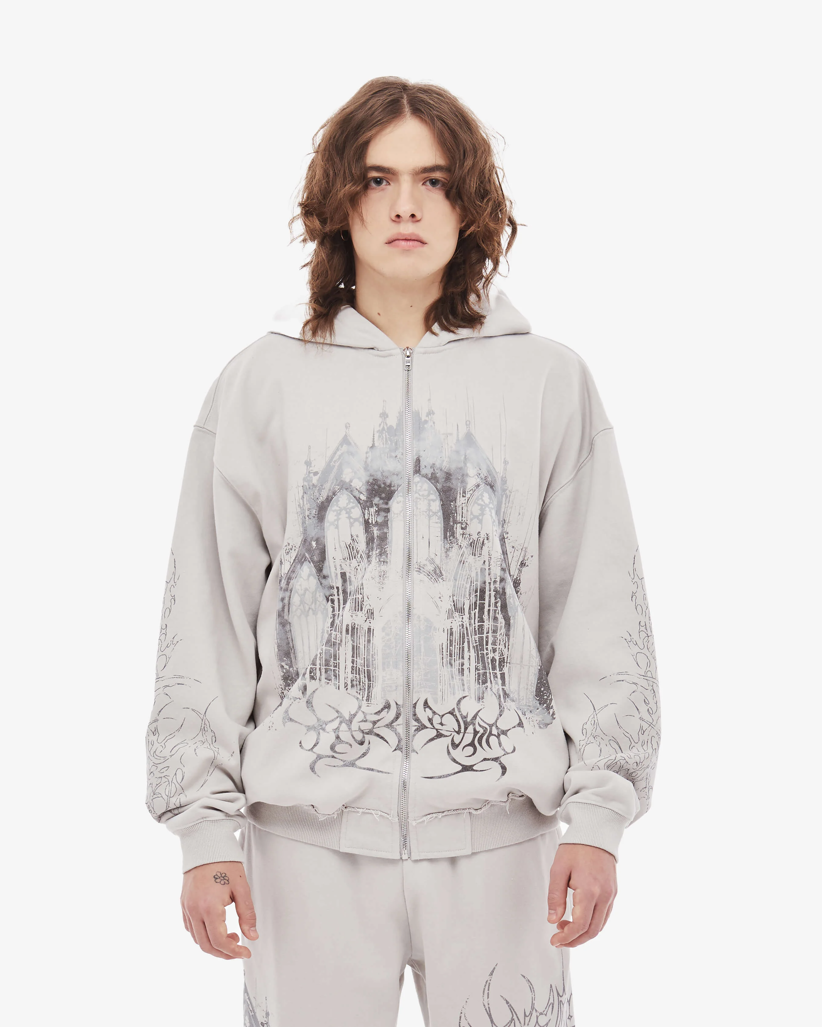 GRAY ECLIPSE ZIP HOODIE This hoodie features printed gothic architecture inspired graphics across the front, sleeves, and hood. Finished with a vintage wash, hidden side pockets, and a comfortable fit. Model is 5'8 and is wearing sz S. MATERIALS 100% Cotton CARE Machine Washable