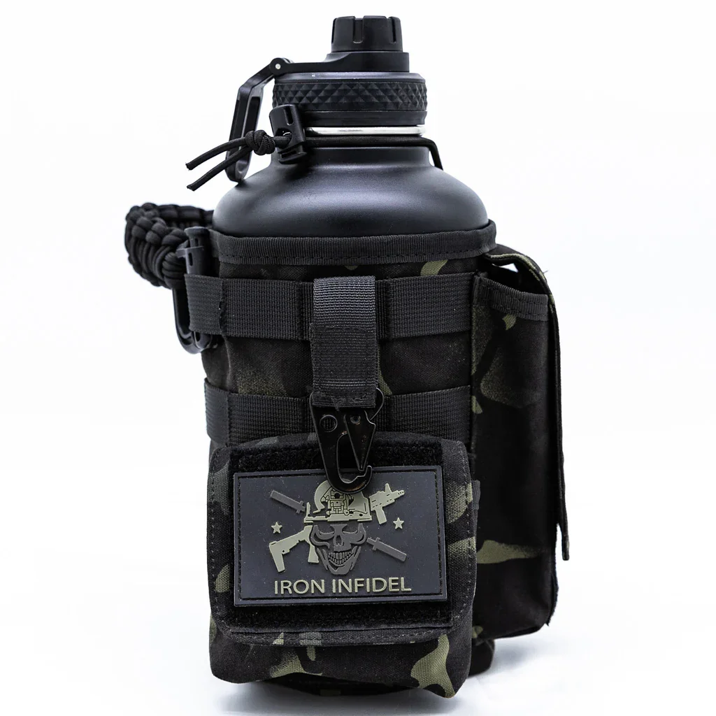 Each pack includes: Wide Mouth Chug cap for upgraded water flow Locking handle lid for attaching accessories and convenient access for pouring Heavy Duty Shoulder Strap for convenient carrying while walking and hiking Two-tone Paracord handle for your Battle Bottle Unique Morale patch & Iron Infidel Logo Decal