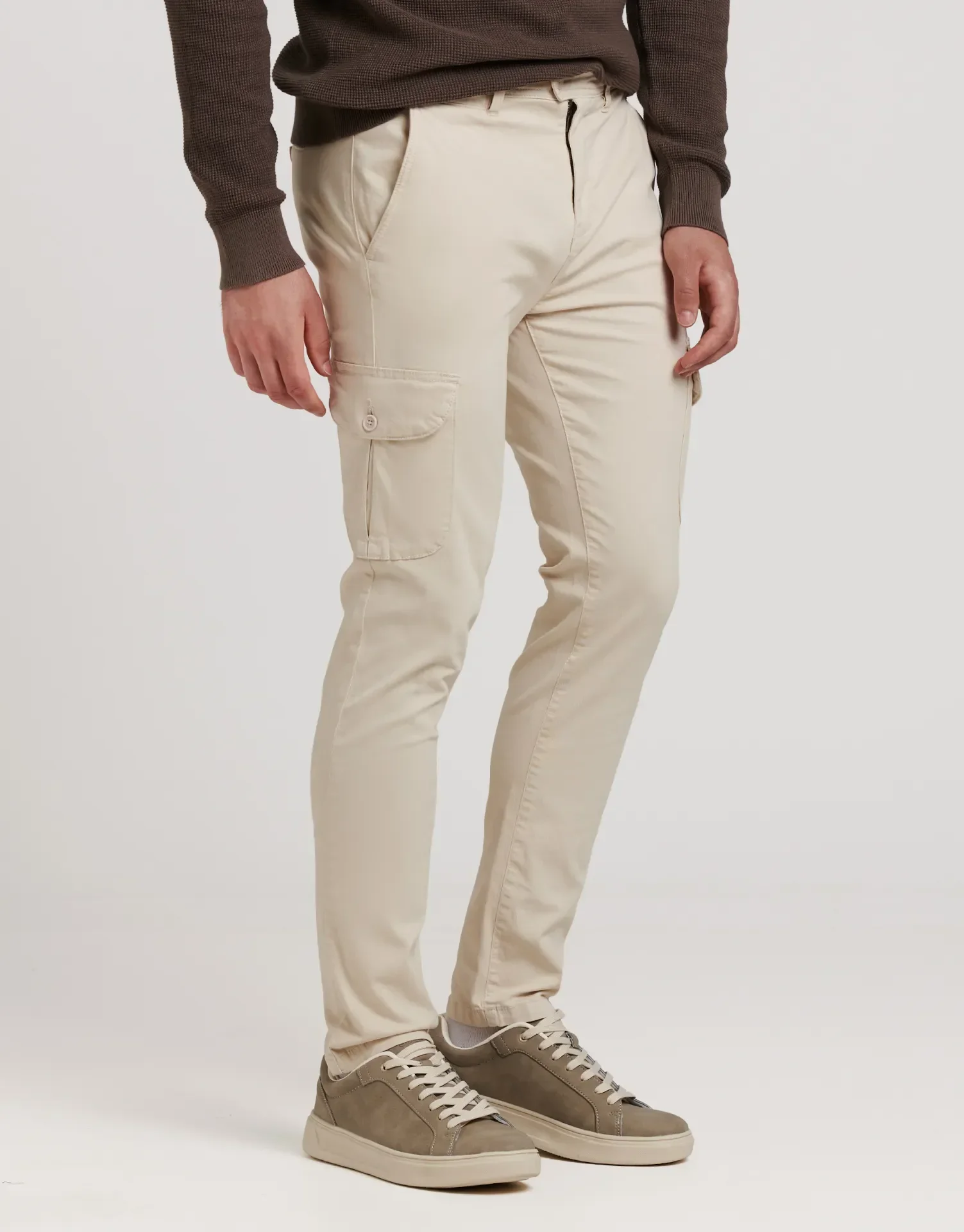Pantalón chino cargo. Corte slim. Bolsillos en los laterales con cierre de tapeta y botón. Cierre mediante botón y cremallera. Bolsillos traseros de vivo con cierre con botón. Composición: 98% algodón 2% elastano