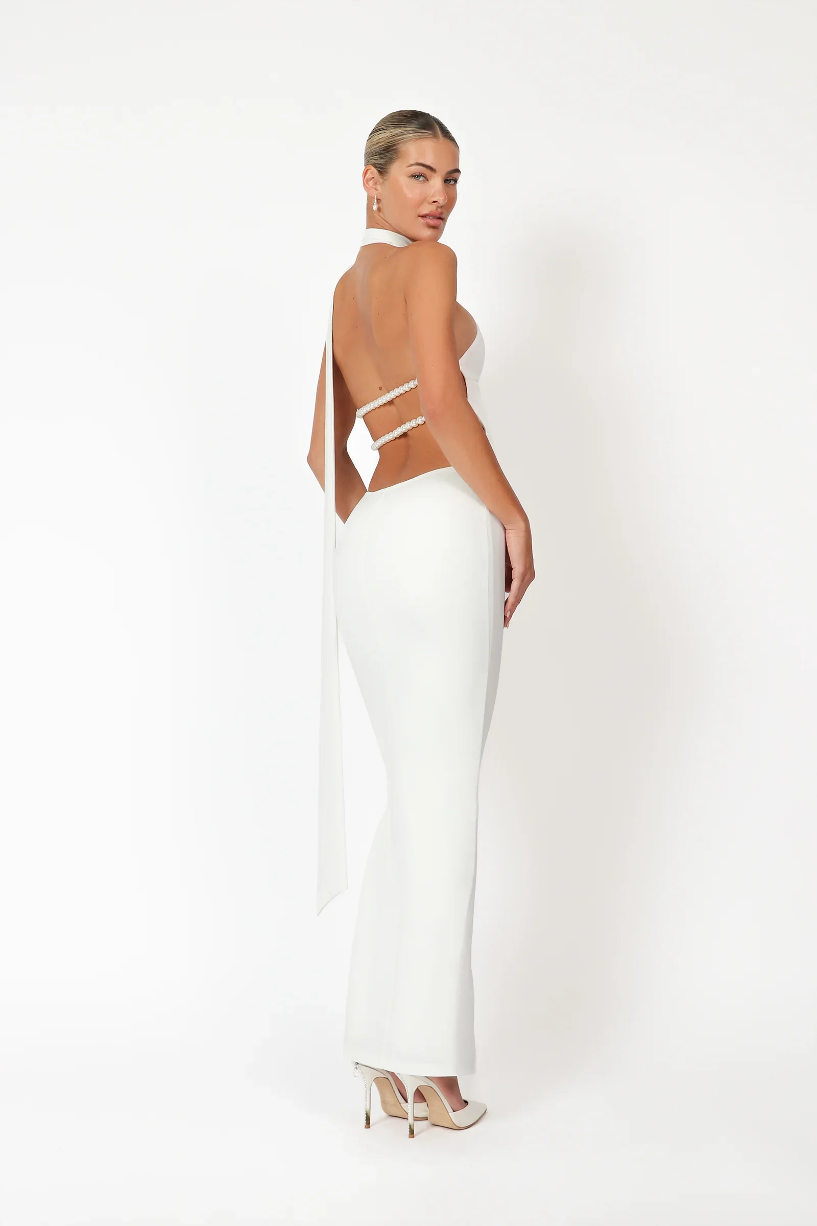 The Kemily dress is a striking silhouette, which is adorned with our signature details of pearl straps across the back, turning it into a statement. Made from figure-skimming stretch satin, this dress is designed with a high neck, skin-baring cutout across the back and a smooth flow across the lower dress. Wear yours with statement gold accessories to finish the look.
