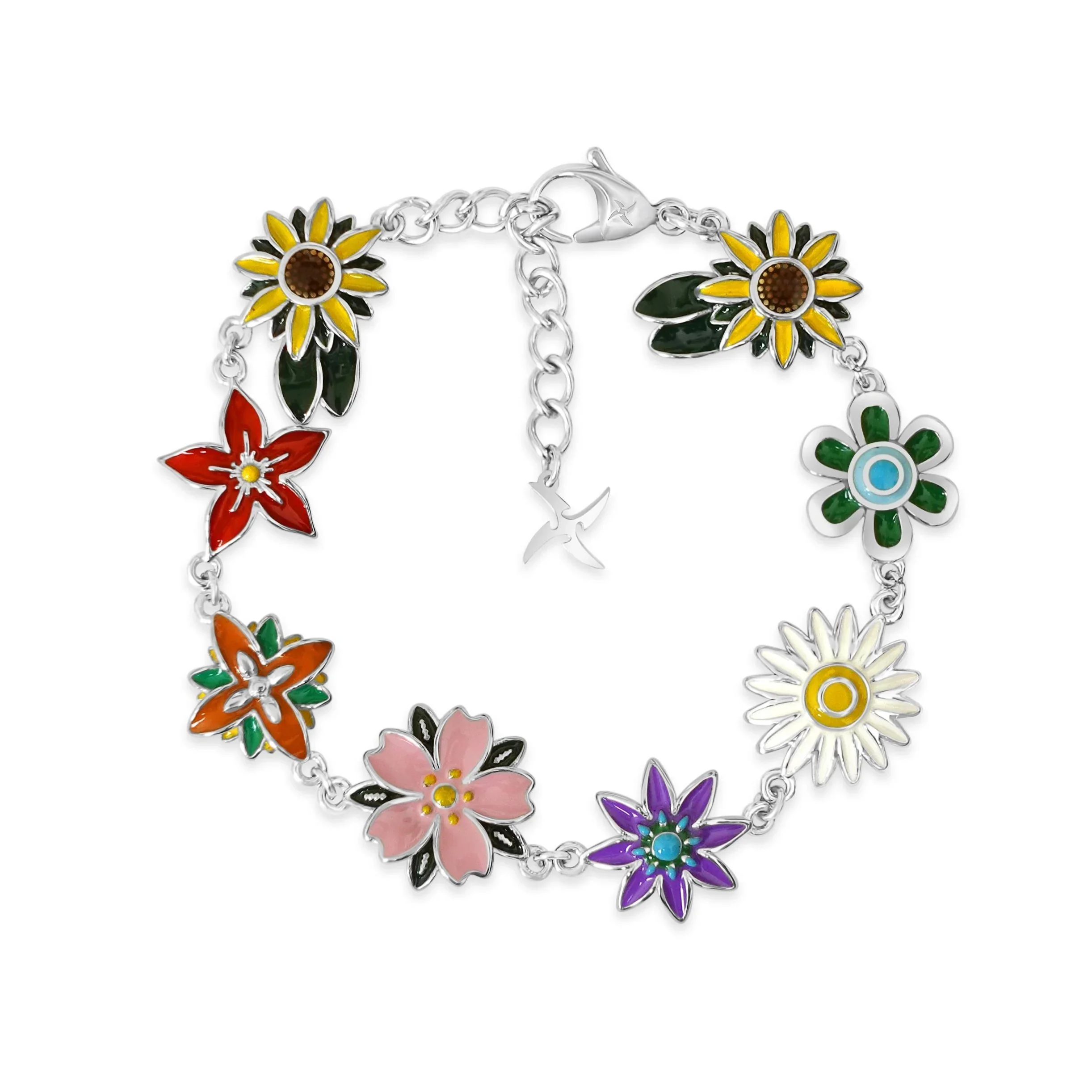 Part of the “Fleeting Beauty” Collection. Kuyashii’s “Flora” Flower bracelet is crafted from solid stainless steel and features 7 different custom designed flower charms. Each charm is hand-filled with enamel that adds a pop of color to any outfit. Available in 5.75-7.25” and 7.25”-8.75” lengths- made possible by 1.5” adjustable lobster clasp closures. Also available in chain lengths here . PRODUCT SPECIFICS Size: 5.75-7.25 Inch | 7.25-8.75 Inch Weight: 15g | 20g Material: Enamel & Stainless Steel