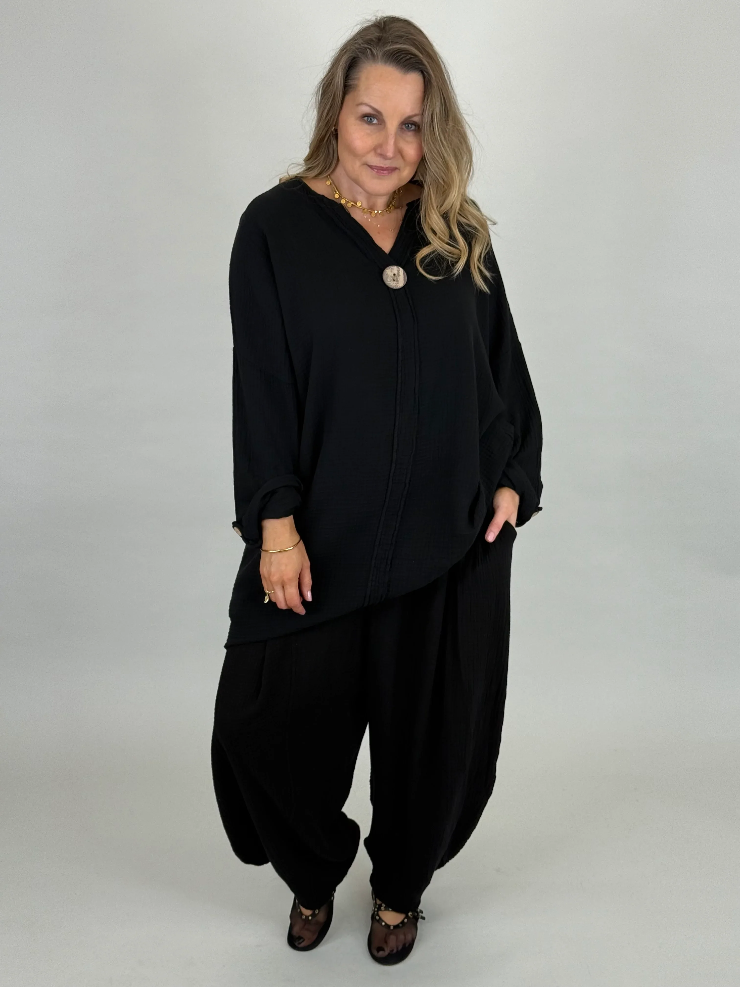 Style Code: 92211 Product Description New Season • Made in Italy The Frankie V neck Top is designed in a relaxed, easy-to-wear shape with a coconut button on the front, with a v neckline, the sleeves are long with a turn tab Button option we just love to roll them for a styled finish. It pairs beautifully with our New Mae or Pip Pants in matching fabric, making it a simple yet stylish outfit choice. Crafted from soft, breathable 100% cotton. Perfect for everyday wear, layering, or dressing up with statement jewellery. Fit & Fabric 100% cotton One Size – fits UK 10–26 MADE IN ITALY | Cotton Frankie One Button Top – Black | One Size 10–26UK Measurements (taken flat) Across chest underarm 28"/71cm Arm width 9"/23cm Hip width 28'/71cm Wearing Length taken shoulder to hem 35"/89cm Model is 5ft3'