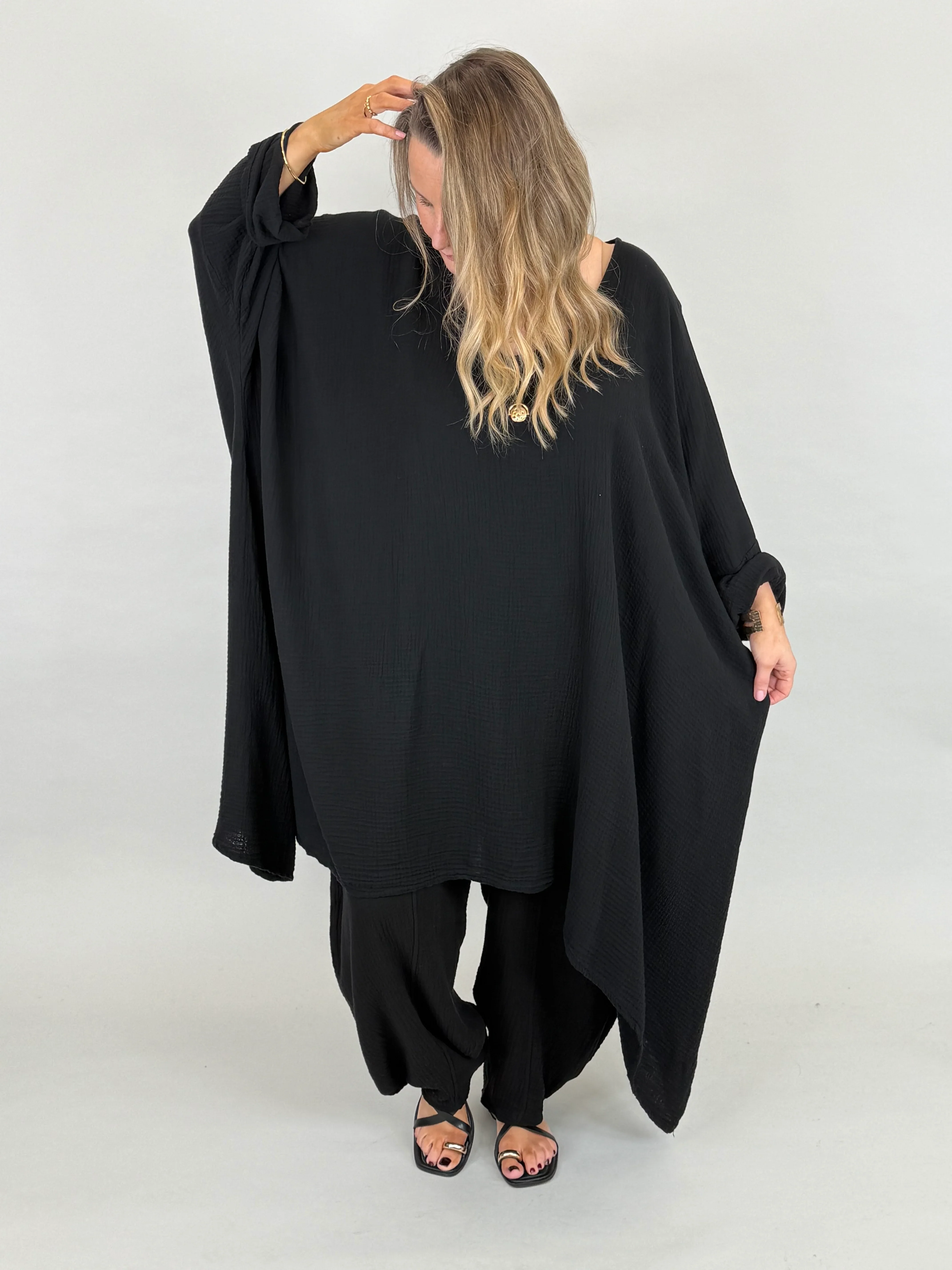 Style Code: 92210 Product Description New Season • Made in Italy The Serena V neck Top is designed in a relaxed, easy-to-wear shape with Longer sides, length that creates a flattering, curved silhouette, the sleeves are midi we just love to roll them for a styled finish. It pairs beautifully with our New Mae or Pip Pants in matching fabric, making it a simple yet stylish outfit choice. Crafted from soft, breathable 100% cotton. Perfect for everyday wear, layering, or dressing up with statement jewellery. Fit & Fabric 100% cotton One Size – fits UK 10–30 MADE IN ITALY | Cotton Serena V Neck Top – Black | One Size 10–30UK Measurements (taken flat) Across chest underarm 44"/112cm Arm width 9"/23cm Wearing Length taken shoulder to hem 47"/120cm Model is 5ft3'