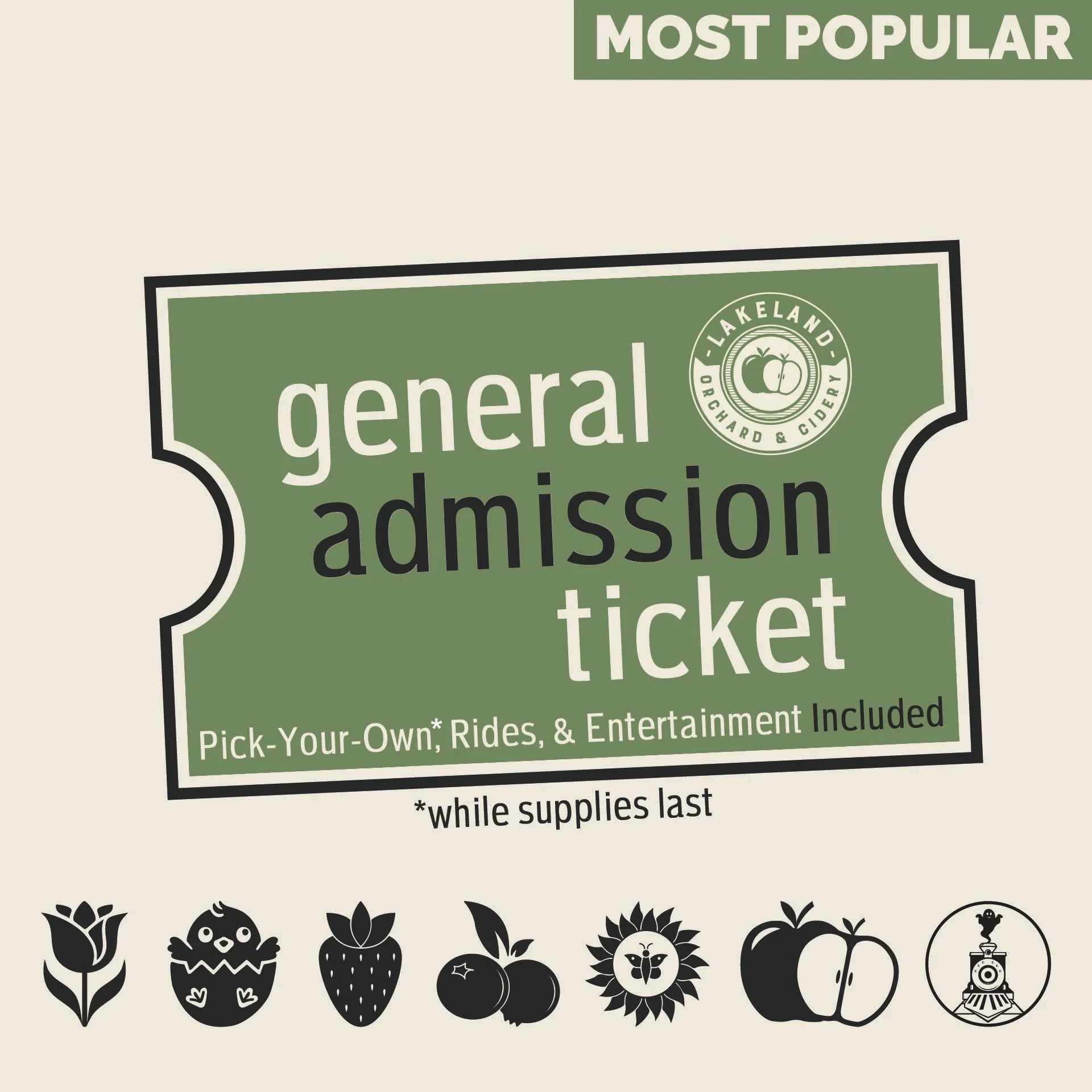 Day Passes are tickets good for a single entrance to Lakeland Orchard & Cidery. Includes a Pick-Your-Own or Cut-Your-Own Card while supplies last and access to all Rides, Attractions, and Live Entertainment for the day of your visit. Day Passes are per person. Anyone aged 3 or older requires a Day Pass (or Season Pass) to enter.