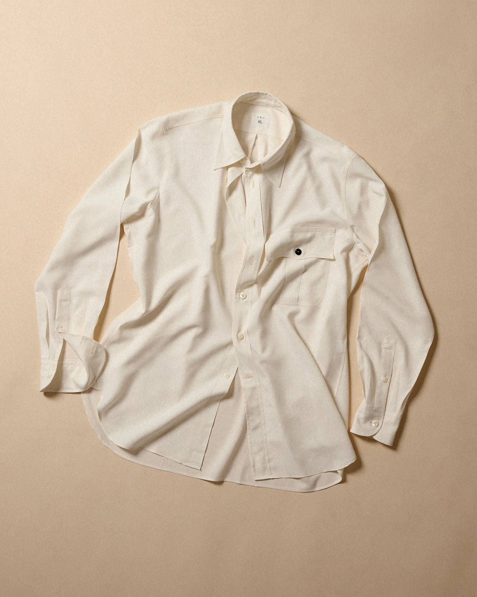 From a small cutting of silk came the rest. The pinnacle of decadence, this shirt is cut from a rich washed silk canvas which develops beautiful textures and character over time. NU-00002 is built on a classic block with a box pleat back - giving plenty of movement and ease - and neatly cut shoulders for a refined and elegant silhouette. Its military heritage speaks through in the twin-needle detailing on yokes, seams, and flap chest pocket - a pocket with more than enough space for sunglasses, pens, and a note or two. Great with cuffs rolled and crumpled, or pressed and tails tucked. The silk that launched a thousand shirts. And counting! - 100% silk canvas, sandwashed, 103gsm - L.E.J mother of pearl buttons - long point collar w/ floating interlining - 1 x large pleated flap pocket - twin-needle yokes + pocket - box pleat at CB - hem gusset - made in Italy - recycled silk can have neps and flecks, which are an inherent quality of this fabric