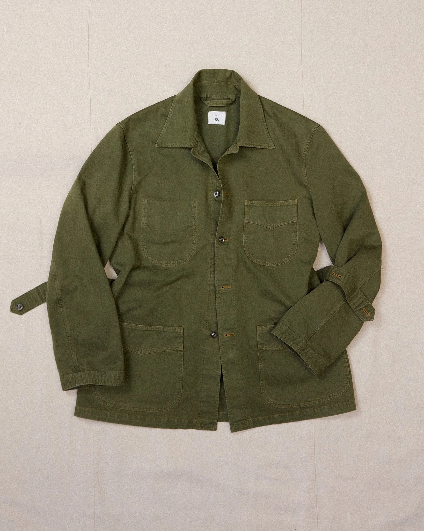 Le Cat Posh Plage Coat is the house favourite throw-around: a work jacket-cum-blazer, cut for lunches at the taverna, and painting sessions on the shore. Featuring a straight body and elegantly shaped sleeve, the waist proportions can be adjusted and cinched to one's daily liking with the use of the martingale. As ever, cut from a perfectly weighted Italian cotton herringbone-twill - a gentle nod to the style’s military forebears - in a rich Olive Green, all washed and ready to be worn. Our best and most sumptuous green yet. Don't be afraid to wear it to work - it can only get better! - 100% cotton HBT, 280gsm - Super fine single-stitch shirt construction - L.E.J mother of pearl buttons - 3 elegantly shaped patch pockets - 1 internal patch pocket - martingale half belt - 2 piece set sleeve - reinforcement straps - unlined - made in Italy