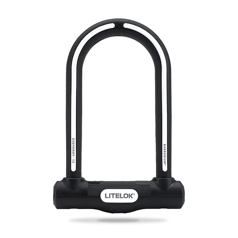 DETAILS All market-leading D-locks are heavy to carry and can be cut by an angle grinder in seconds....Until now. LITELOK X1 is armoured with Barronium®, a patent pending composite material that resists angle grinder attack by turning the grinder's energy and force in on itself. It offers at least 5 times more resistance than the best-selling D-locks without adding any extra weight. It is permanently fused to a hardened fine-grain high-tensile steel core which provides protection against all other commonly used tools such as bolt croppers, cable cutters, long bars, hammers and chisels. Barronium ® fused composite armour repels angle grinder attacks Unique anti-rotation feature protects against twisting attacks and single cuts The natural finish soft plant-based eco-rubber outer layer won't damage your frame Engineered for smooth and quiet operation Quick to affix and remove with our universal ‘ Twist & Go ’ frame mount Reflective strips keep you safe and seen Unique, innovative self-sealing silicone keyhole cover that keeps dirt, dust and moisture out. Independently tested and approved by Sold Secure Certified Sold Secure Bicycle Diamond and Sold Secure Motorcycle Diamond Proudly Made in Britain using precision engineering Off SPECIFICATIONS LITELOK X1 SECURITY Anti-Angle grinder (5x more angle-grinder resistant than the current best-selling, best performing D-locks). Sold Secure Motorcycle and Bicycle Diamond . WEIGHT 1.7kg / 3.7lb INTERNAL DIMENSIONS 101 x 197mm (3.97 x 7.7") EXTERNAL DIMENSIONS 143 x 265mm (5.62 x 10.6") SHACKLE DIMENSIONS 21 x 24mm LOCK BODY DIMENSIONS 35 x 175mm (1.3 x 6.9") LOCK ART4 accredited cylinder MOUNT Twist & Go mount included (Restrap lock holster available for purchase separately)