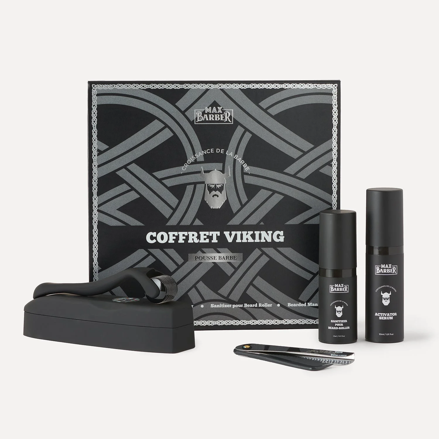 Dans ton Coffret Viking, tu reçois l’équipement complet pour booster ta barbe : - Sérum Activateur (30 ml) pour nourrir et stimuler - Beard Roller pour activer la circulation - Spray Sanitizer (15 ml) pour désinfecter et protéger - Peigne Viking pliable pour dompter ta barbe
