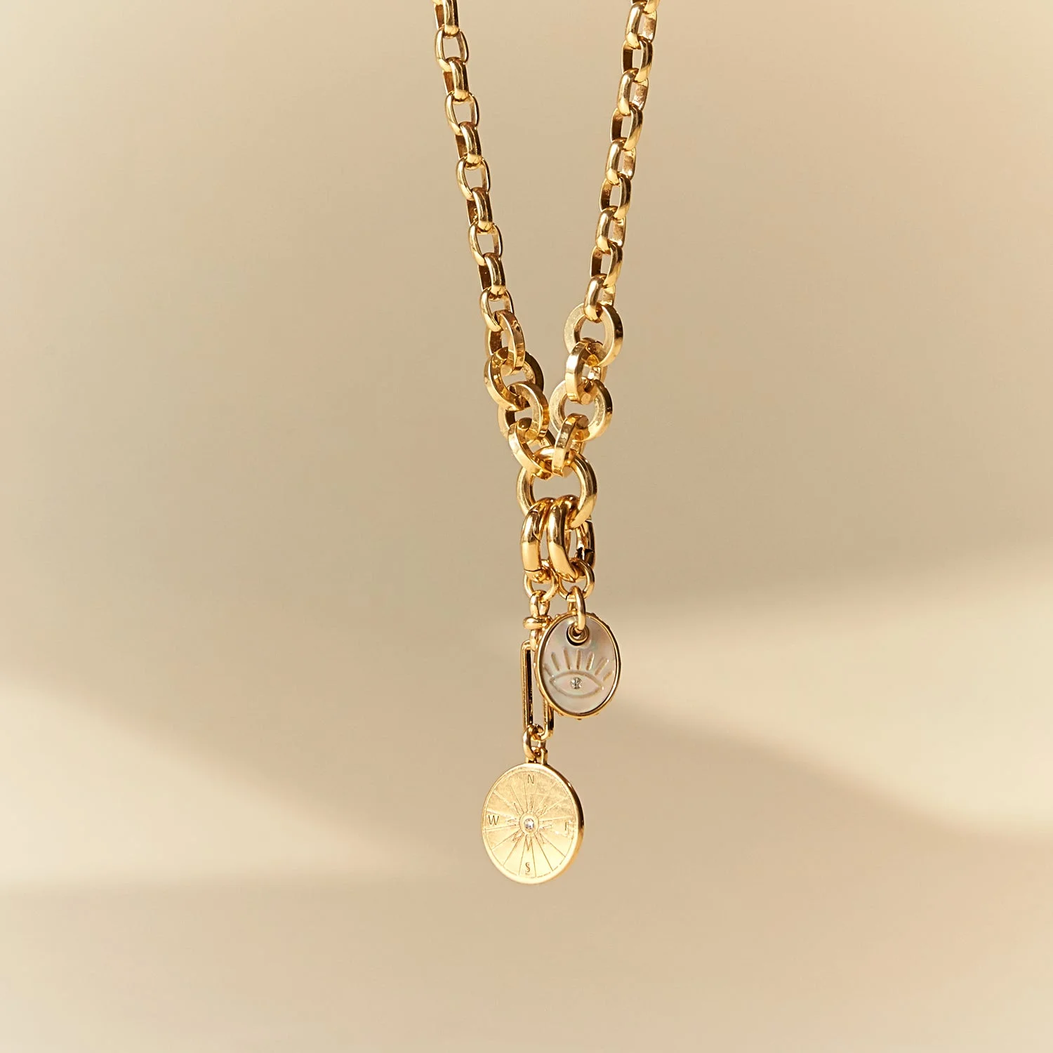 Our Charms Collection best-seller! Pieces rooted in the idea of connectedness, designed to instill a promise of optimism. The easiest layering piece, this necklace has streamlined minimalism to it that we find incredibly refreshing. With subtle variation in chain details and scaled back sizing of charms, this necklace embodies a mix of sophistication & playfulness that we adore. Marked by the protection and travel charms, a promise of safe journeys ahead is present. Compass: Embodying the essence of MG, we give an ode to our love for travel and the guiding force that leads us to new adventures. Forever seekers, this compass is an assuring and grounding presence. Mother of Pearl Eye: Symbolizing protection and perspective, this charm represents a deeper desire for understanding and widening of imaginations.