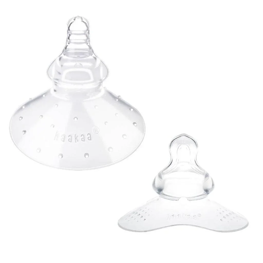 The Haakaa Breastfeeding Nipple Shield! A world 1st design made of 100% soft silicone. An extended teat puts space between your nipple & baby's mouth. If your little one bites down, pulls away, or if you have inverted or cracked nipples, you will still be able to breastfeed with ease and comfort. Our Nipple Shields suction onto your breast, giving you a hands-free breastfeeding experience. Available with a round or triangle base, the Haakaa Breastfeeding Nipple Shield allows all mums to experience the beauty of breastfeeding without the worry of discomfort and pain! The round base is larger and suctions on more easily, making it more suited for those who are new to using nipple shields. The triangle base is smaller, but allows for more skin-to-skin contact, making it more suited for those who are more experienced with using nipple shields. We offer two teat shapes: the orthodontic teat and the nipple teat. The orthodontic teat is thumb-shaped to replicate the shape of a mother's nipple during breastfeeding, making it more readily accepted by your baby. The nipple teat replicates the silicone teat of a baby bottle and is better suited to help your baby transition from breast to bottle. The Orthodontic Breastfeeding Nipple Shields have an opening that's 28mm in diameter and the Bottle Breastfeeding Nipple Shields have an opening that's 23mm in diameter for your nipple. This product is designed for mothers who are physically unable to breastfeed due to sore, cracked nipples and should only be used in the interim before returning to natural breastfeeding once your nipple has healed. If you are able to breastfeed successfully and experience slight discomfort, we suggest using the Haakaa traditional nipple shields as a protective alternative if your nipples become raw and sore. Includes one shield and a protective case for storage. Silicone Nipple Shield Round Orthodontic Round Orthodontic Triangle Key Advantages Ultra-thin silicone moulds to your breast for a natural experience Secure coverage and suction favoured by new mums Secure coverage and a teat that's modelled on a natural nipple shape to help prevent confusion A natural teat shape to help prevent confusion, with a smaller base for increased breathability Teat Moulds to breast shape Extended baby bottle teat with physical space to protect mum's nipple Natural thumb-shaped teat with physical space to protect mum's nipple Natural thumb-shaped teat with physical space to protect mum's nipple Silicone Thickness Suction No Yes Yes Yes Suitable For Mums with minor discomfort when feeding Mums unable to feed due to sore, cracked nipples. Babies mixed feeding or transitioning to bottle feeding Mums unable to feed due to sore, cracked nipples. Babies who have only been breastfed Mums unable to feed due to sore, cracked nipples. Babies who have only been breastfed Features Patented one-piece design with no joints, cracks or edges. Nipple design allows babies to mimic a natural sucking rhythm, making it easier for babies that have difficulty latching. Suctions on to all breast shapes, making it easier for new mums to use and enjoy a hands-free breastfeeding experience. The anti-slip ridged outer edge make the nipple shield easier to hold while the baby is feeding. Anti-colic and variable flow nipple allows baby to drink continuously without gasping for air or drinking bubbles and prevents them from choking if milk flows too fast. Space between mum’s nipple and the nipple shield head prevents baby from biting the nipple. BPA, PVC and phthalate-free. Cleaning and Care Wash before and after each use. Although dishwasher safe, we recommend hand washing in warm soapy water and rinsing and drying thoroughly. Do not use any bleach-based cleaners or tablets to sterilise or clean your Haakaa products. To sterilise, use a steam steriliser or boil in water for 2-3 minutes. Caution: Check product condition regularly. Replace if this product shows any signs of damage. Do not store near any sharp objects. Only soft bristle brushes or soft sponges should be used to clean this product as hard scourers may scratch the surface. Children can choke on small objects if left unattended. This product is not a toy. Do not use this product for anything other than its intended purpose. Store product in a cool dry place and avoid direct sunlight. Excessive stretching may cause tearing.