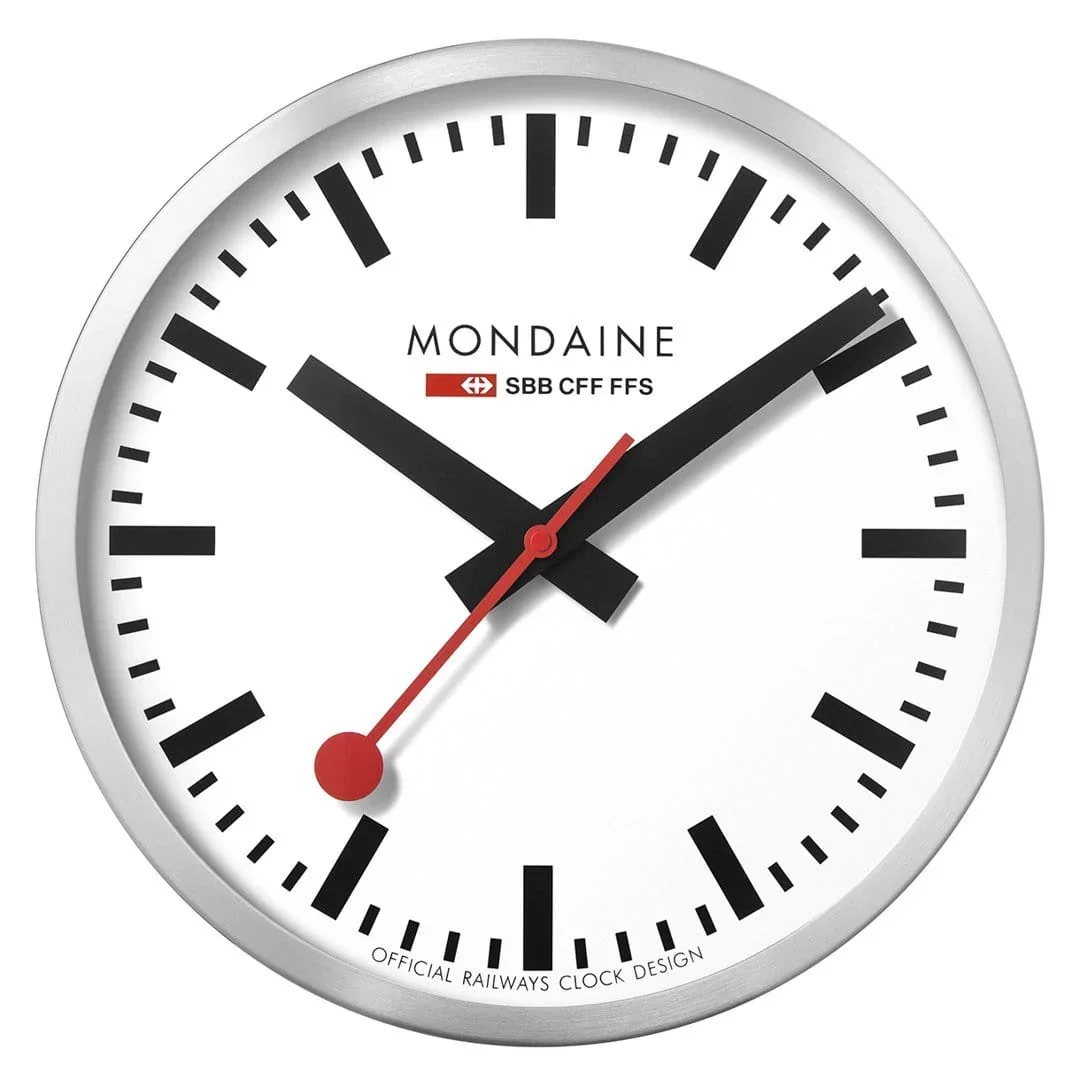 Description Industrial design on the wall This Mondaine Official Swiss Railways Clock impresses with its puristic and minimalistic design of the dial with the prominent red second hand. With its 25cm diameter and the stylish aluminium casing, it blends beautifully in every room. The clock has a sweeping second hand. In 1944 the Swiss engineer Hans Hilfiker invented the Swiss railways clock. The characteristic red second hand soon became its most recognizable feature. The minimalistic, yet functional design, reminiscent of the Bauhaus style, makes this clock a true icon. Get a piece of industrial design history up on your wall! Mondaine has a long watchmaking tradition and our watches are synonymous with Swiss quality in design and manufacturing. Every clock is subject to tight quality controls and comes with a 2 year international warranty. Details Model number: A990.CLOCK.16SBB Function: Time Movement: Quartz Caliber: Seiko 44808V Water resistance: {Water_resistance_m_ft_at} Case: Aluminium Case diameter: 250 mm Case back: 316L Stainless steel screw on Crown: {Crown} Crystal / glass material: Hardened mineral crystal Strap / bracelet: {Color_of_strap, Strap_/_bracelet} Strap / bracelet buckle: {Strap_/_bracelet} Lug width: {Width_of_strap} Origin: FarEast movement