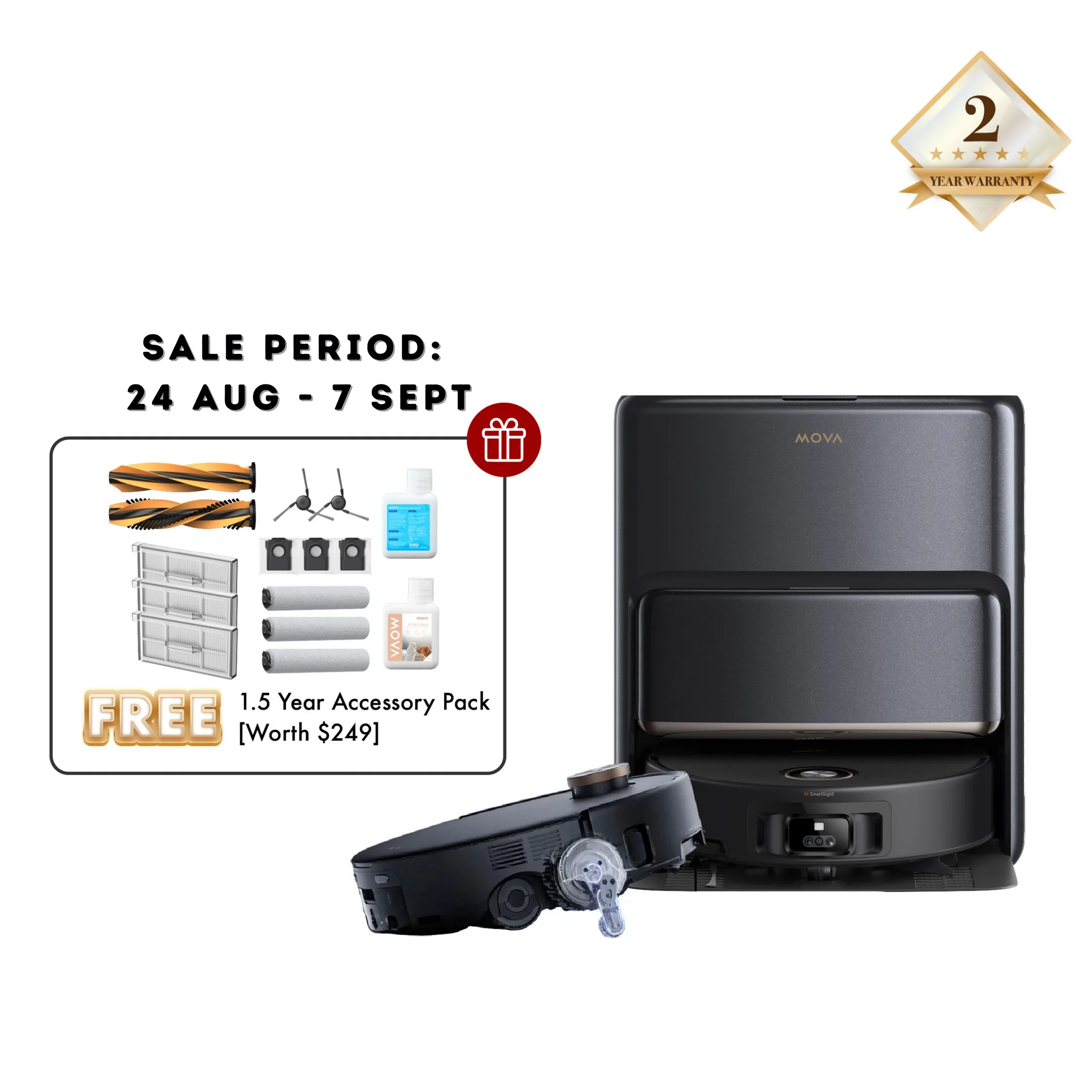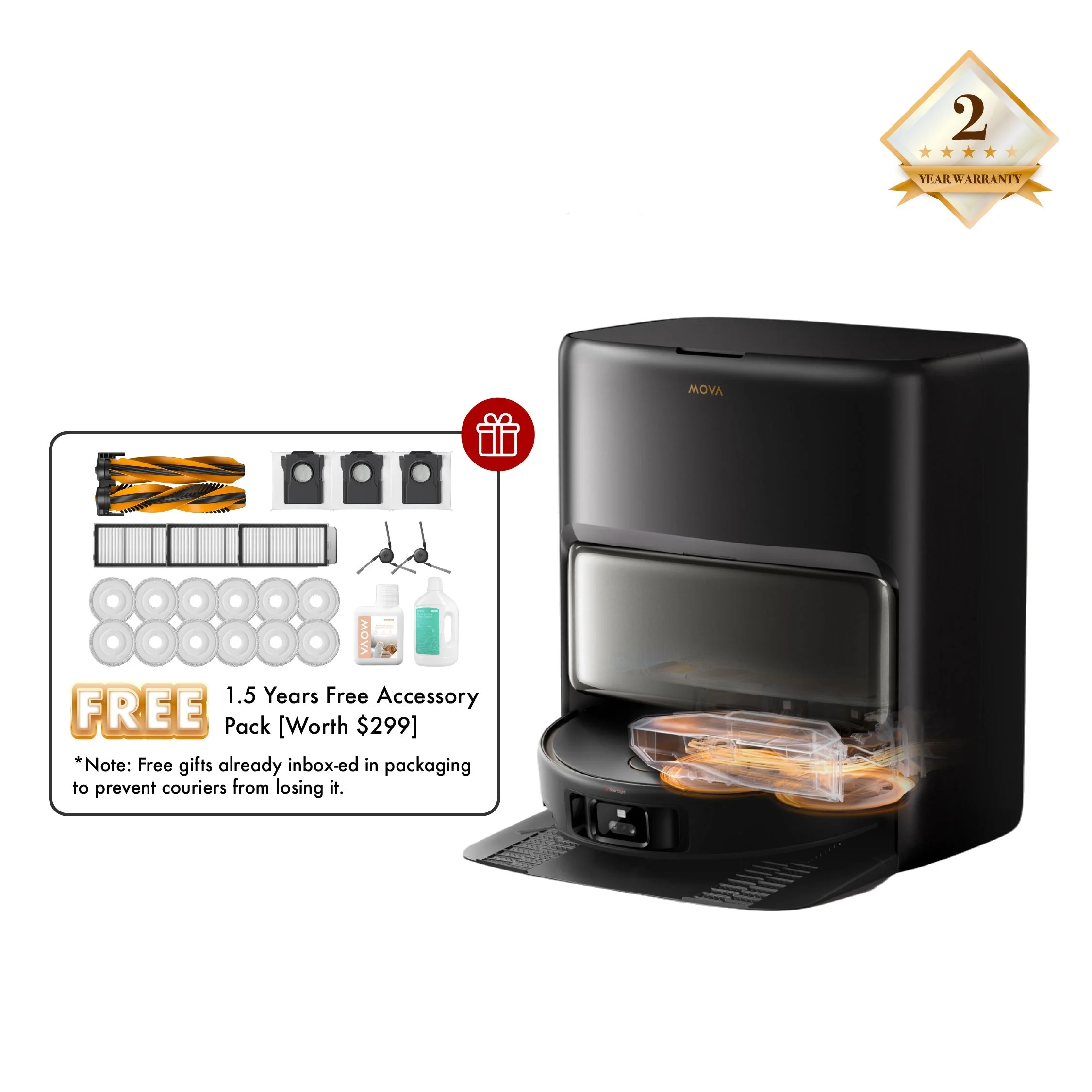 INCLUDES 1.5 Years Accessory Pack [Worth $299] (INCLUDES 12x Mop Pads + Filter x3 + Dustbag x3 + Side Brush x2 + Main Brush x1 + Detergent x1 + Pet Detergent x1) *Note: Above mentioned accessories are already inbox-ed in the packaging. They are pre-packed inside to prevent the loss of accessories from couriers. (Robot Vacuums with "Complete Version" represents that the model itself provides the above accessories in the packaging) (No separate accessories provided) "Complete Version" = Provides additional accessories in packaging 🚛【New Launch】 Local Seller, Ships from Singapore 🔰【2 Years Official Warranty】 Peace of Mind 🗝️【SG Service Center】 Professional & Fast Response to Resolve all Issues / Reliable ⭐ 【Expert Live Agent Support】 Live Chat Agents Ready - Our agents are standing by to resolve your inquiries promptly, ensuring a seamless shopping experience. ⭐ -- RANKED & REVIEWED ON VACUUM WARS -- ⭐ 🔥 【6CM Obstacle Climbing + AI Chassis for Smoother Glide】 With 6cm (4.2 + 1.8cm) obstacle crossing, it can easily cross over steps, thresholds, door tracks, U-shaped furniture legs & small obstacles. The motorized swing arm lifts the chassis, allowing smooth travel over complex terrains like door sills & steps, allowing uninterrupted & efficient cleaning. 🔥 【50°C Thermo Mopping - Dissolves Stubborn Stains】 Auto water tank refilling with up to 50°C water for mopping. With this, it can effectively dissolves tough stains & eliminates pet odors, leaving your home clean & fresh. 🔥 【Extendable & Liftable Mops + Side Brush - 100% Edge-Corner Cleaning】 - Extendable Side Brush (Anti-Tangle) = Reaching out at tight corners & under furniture, ensuring a 100% clean in tight corners. - Extendable & Liftable Mop Pads = Allows the mop to extend to handle messes along the edges & irregular corners. In difficult areas, the robot vacuum rotates its body with the mop extended, reaching further by up to 4cm* to get into hard-to-reach corners & hidden areas. 🔥 【AI FlexiRise™ Navigation】Rises in Open Area. Lowers in Lower Ones. Lowers its LDS head when detected low profile furnitures, thus gliding under sofa / beds for thorough cleaning, even in tight spots. Rises its LDS head when scanning for 200+ objects, ensuring high precision obstacle avoidance. 🔥 【24,000Pa Suction & Anti-Tangle TroboWave™ DuoBrush】 24,000Pa Powerful Suction & Anti-Tangle TroboWave™ DuoBrush combines together to effectively remove hair and dust, capturing up to 99.5% of large particles. 🔥 【All-In-One Base Station = Automate Troublesome Tasks】 - Auto hot water tank refilling for mopping - Auto-empty (Hands-free for up to 100 days with 3.2L dustbag) - Auto solution refill with DuoSolution system - Auto mop drying with hot air 🔥 【DuoSolution System - 2 Detergent Containers for More Effective Cleaning】 - Container A: Maintains general cleaning solution - Container B: Pet Odor Solution 🔥 【UV Sterilization for Enhanced Hygiene】 UV sterilization eliminates 99.99% of the bacteria on mops & dust bag after the cleaning & auto-empty process. 🔥 【In-Dept Pet Care, Pet Care Customization】 - Large Particles Boost Mode 2.0 - Pet Zone Cleaning Customization - Dynamic Coverage for Pet Areas - Remote Pet Monitoring, Extra Cleaning for Pet-Active Zones - Pet-Finding Mode, Pet Vlog Auto Generation --- 𝐒𝐏𝐄𝐂𝐈𝐅𝐈𝐂𝐀𝐓𝐈𝐎𝐍 --- 📌 Robot Vacuum Dimensions: 350 x 350 x 111 mm 📌 Base Station Dimension: 420 x 458 x 470 mm 📌 Obstacle Crossing Height: 6cm (4.2 + 1.8 cm) 📌 Maximum Suction Power: 24,000Pa 📌 Extendable Mop Pad + Side Brush: Yes 📌 Auto Water Refilling for Mops: 50℃ 📌 Mop Hot Water Wash: 80℃ 📌 Mop Hot Air Drying: 60℃ (Dust Box & Dust Bag Drying) 📌 Clean/Used Water Tank: 4 / 3.5L 📌 Dust Bag Capacity = 3.2L (Auto-Empty Up to 100 days) 📌 Identify Up to 200 Objects with Advanced Obstacle Avoidance -*𝐇𝐈𝐆𝐇𝐄𝐒𝐓 𝐢𝐧 𝐈𝐧𝐝𝐮𝐬𝐭𝐫𝐲 --- 𝐌𝐎𝐕𝐀 𝐖𝐀𝐑𝐑𝐀𝐍𝐓𝐘 --- ✅ 𝐄𝐱𝐜𝐥𝐮𝐬𝐢𝐯𝐞 𝟐𝟒-𝐦𝐨𝐧𝐭𝐡𝐬 𝐎𝐟𝐟𝐢𝐜𝐢𝐚𝐥 𝐌𝐎𝐕𝐀 𝐖𝐚𝐫𝐫𝐚𝐧𝐭𝐲 -Warranty is automatically activated when product is shipped to buyer. ✅ 𝐒𝐢𝐧𝐠𝐚𝐩𝐨𝐫𝐞 𝐒𝐞𝐫𝐯𝐢𝐜𝐞 𝐂𝐞𝐧𝐭𝐞𝐫 - Faster Repairs / Lower Downtime / Face-to-Face Support / Peace of Mind / Cost Savings. ✅ 𝐇𝐚𝐬𝐬𝐥𝐞-𝐟𝐫𝐞𝐞 𝐑𝐞𝐩𝐚𝐢𝐫 - Utilizing genuine parts when necessary, covering parts and labor. ✅ 𝐁𝐮𝐲 𝐟𝐫𝐨𝐦 𝐀𝐮𝐭𝐡𝐨𝐫𝐢𝐳𝐞𝐝 𝐎𝐧𝐥𝐲 - Ensure warranty eligibility