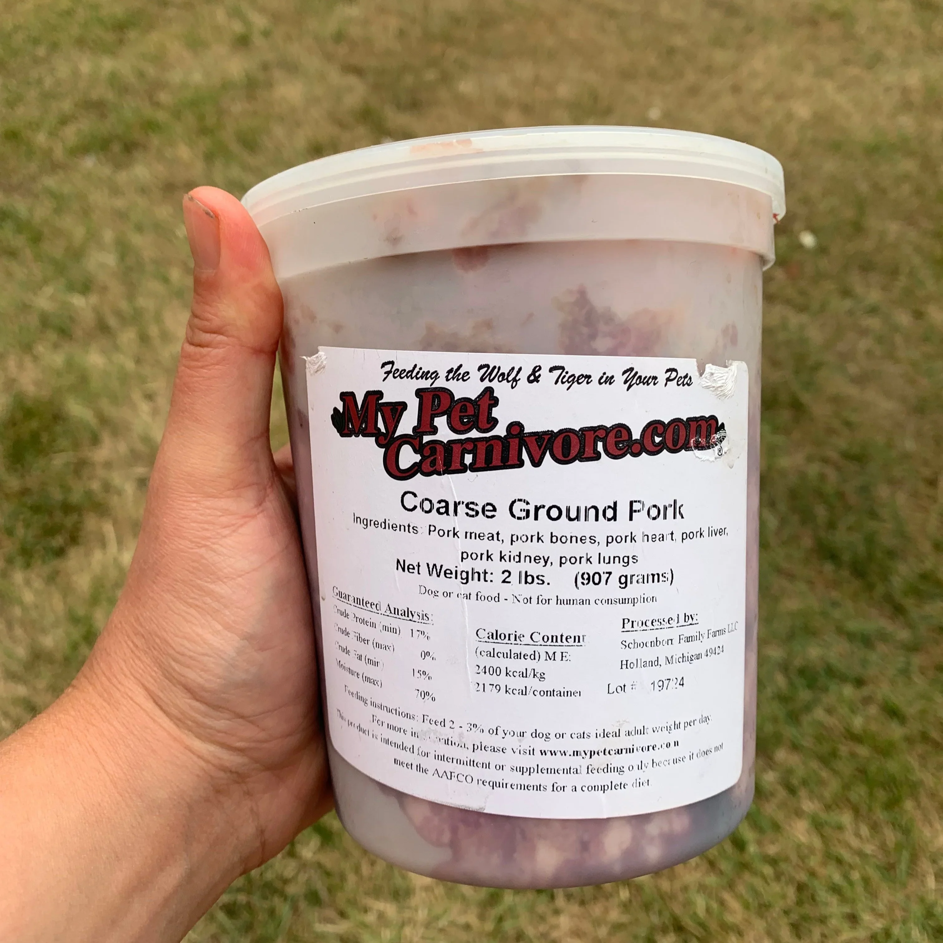 Coarse Ground Whole Pork-2 LB. Coarse Ground Whole Pork contains meat, organ & bone & is packaged in a convenient 2 LB. deli container. This lovely selection is coarse ground from Michigan-raised pigs. Our pork is fresh frozen for your pet's optimal health! These Michigan pigs have been living the good life. It's one of our most popular products with good reason! It is the quality that's available exclusively through My Pet Carnivore! The average prey animal has about 10% to 15% bone, about 10% organs & the rest muscle, fat & connective tissue. That is Mother Nature's model & therefore our model ratio for all of our Whole Ground products. We do not sell any products that contain denaturants, added colors, preservatives, artificial ingredients & no HPP. There are no grains, fruits or vegetables added to any of our products. It's part of our commitment to quality. We believe in feeding a nutrient-rich meat, bone & organ diet–a carnivore diet as Mother Nature intended!