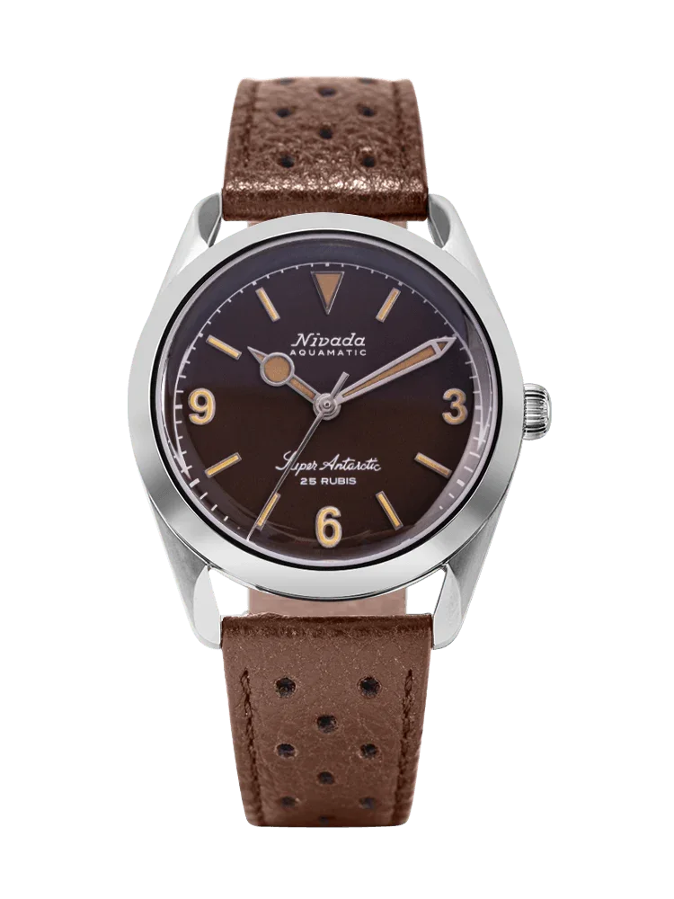 A faithful reissue born from the Nivada community, the Super Antarctic 3.6.9 revives a vintage icon with modern upgrades. Featuring a 38 mm stainless steel case, sapphire crystal, Soprod P024 automatic movement, and 10 ATM water resistance, it keeps the spirit of the original alive with aged-effect dial and hands, tropical or matte black options, and the signature gold medallion on the caseback.