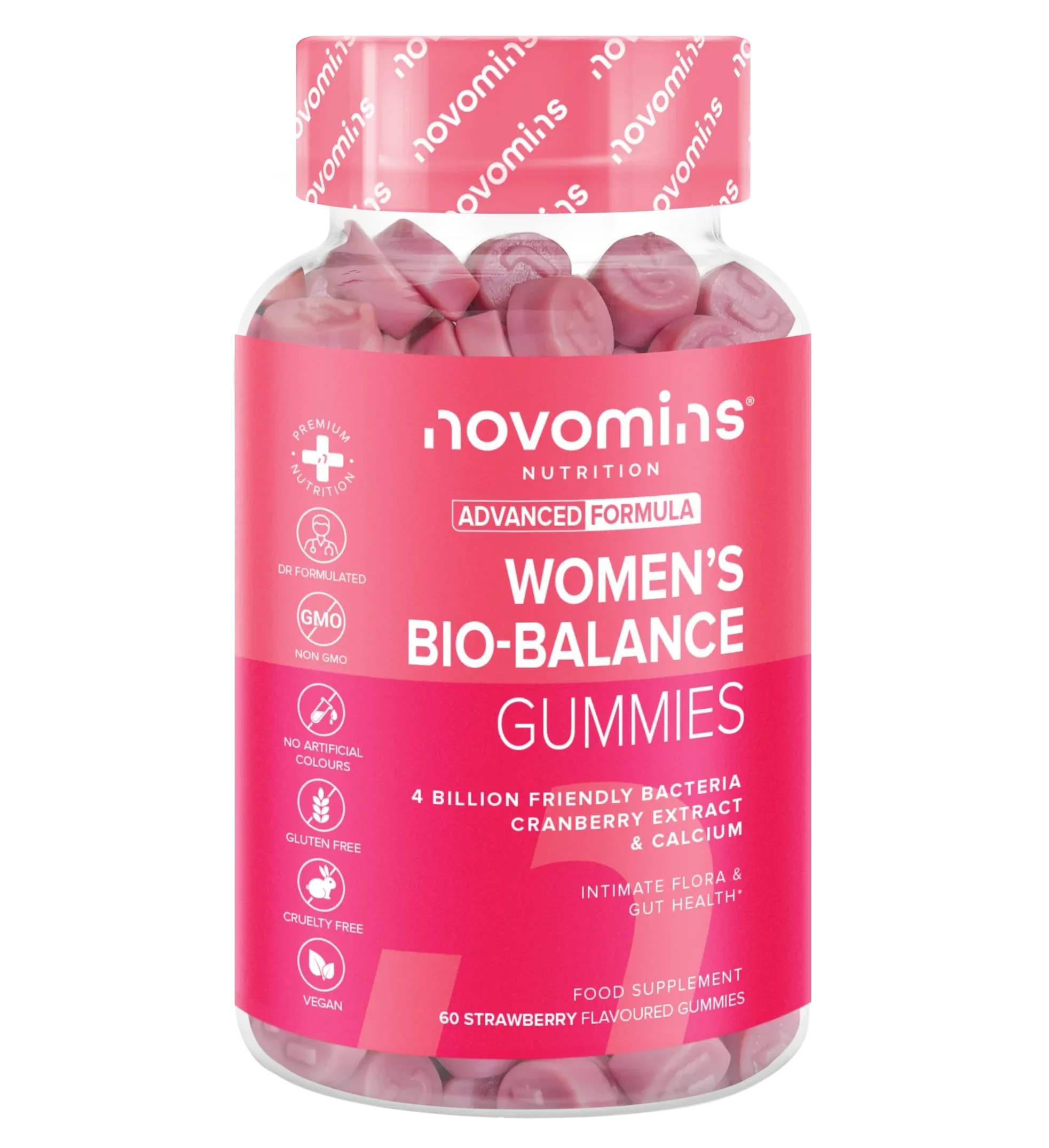 4 billion gut- and female intimate-area-friendly bacteria in every delicious gummy. With clinically studied strains, cranberry extract, and calcium; Women’s Bio-Balance is your daily support for digestive health and intimate flora. Our formulation contains friendly bacteria that targets the gut, where most of the immune system is located.