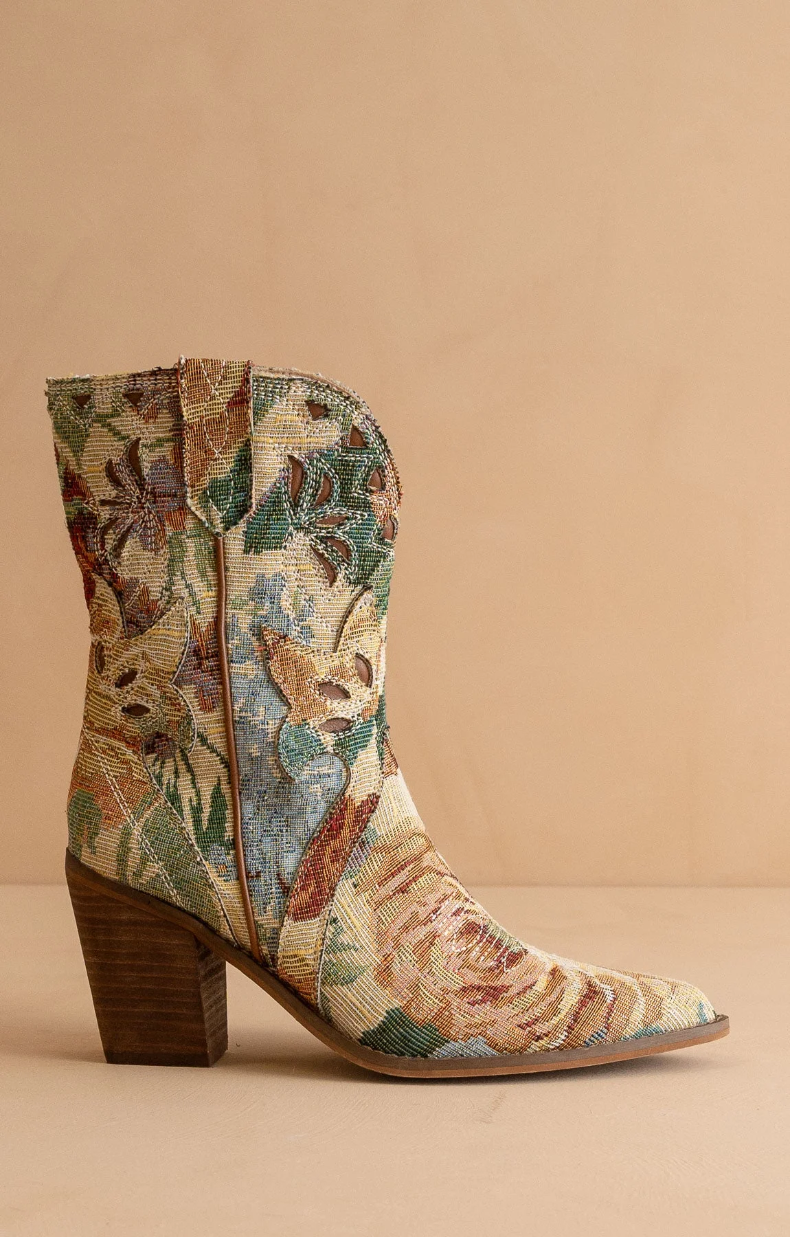 You saw it here first—the viral boot that’s sold out 10x and counting. Inspired by vintage carpet bags, this statement bootie brings old-world charm with a modern edge. Crafted from atelier-selected materials , it’s the perfect mix of nostalgic and now. Don’t wait—these won’t stay in stock for long. Due to the unique patterning of the materials each shoe will have a unique pattern that may not match the other foot. SIZING RECOMMENDATION: The unique tapestry material of this boot contains no elastic, which results in a wider fit. We recommend sizing a half size down for all narrow to normal width feet. MATERIALS: Upper Material: Tapestry Floral Textile Insole Material: DreamCloud Cushion Sole or Heel Material: Leather Wrap Heel DETAILS: Brand: Oasis Society Shaft Height: 7" Heel Height: 3.25" Shaft Circumference: 11.25"