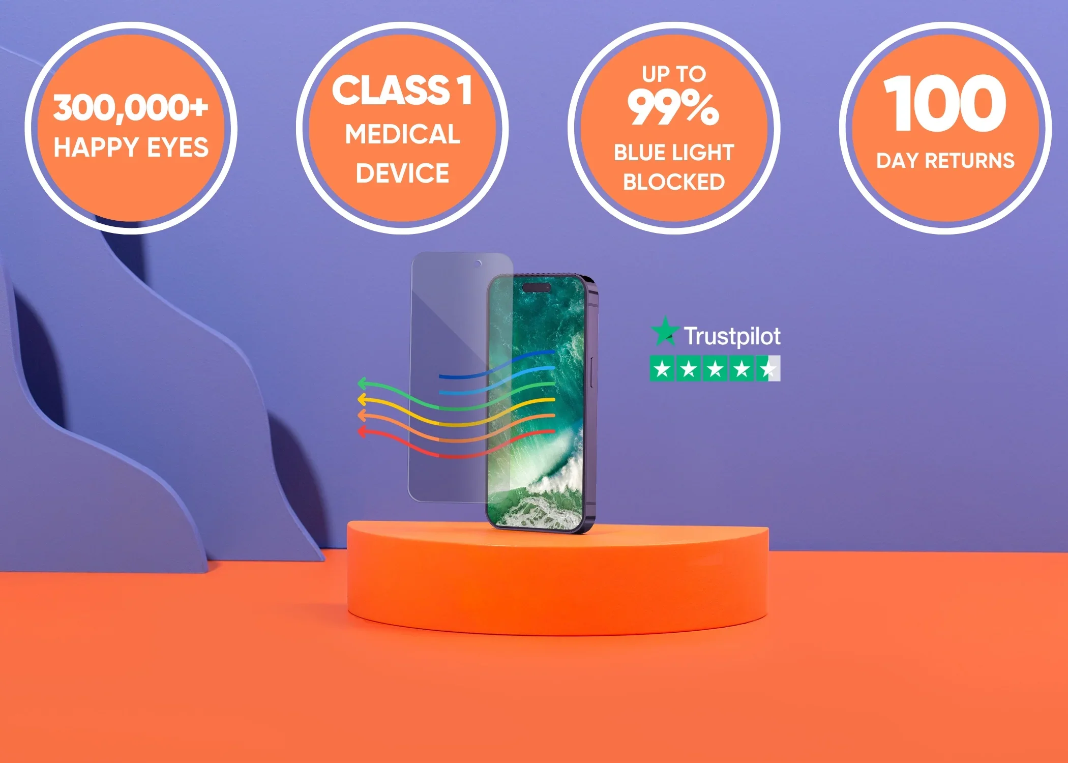 Protect your eyes, skin and sleep better Proprietary medical grade blue light technology No retro orange tinge, a crystal clear picture Infused privacy filter, stop prying eyes Anti-glare coating, no more reflections Anti-bacterial coating, good for shared devices We donate to global eye charities Guide Dogs & Orbis for every order Designed & developed by Optometrists in the UK Class 1 Medical Device registered with the FDA & MHRA Exclusively Patent Pending status from the Intellectual Property Office AS SEEN ON DRAGONS' DEN