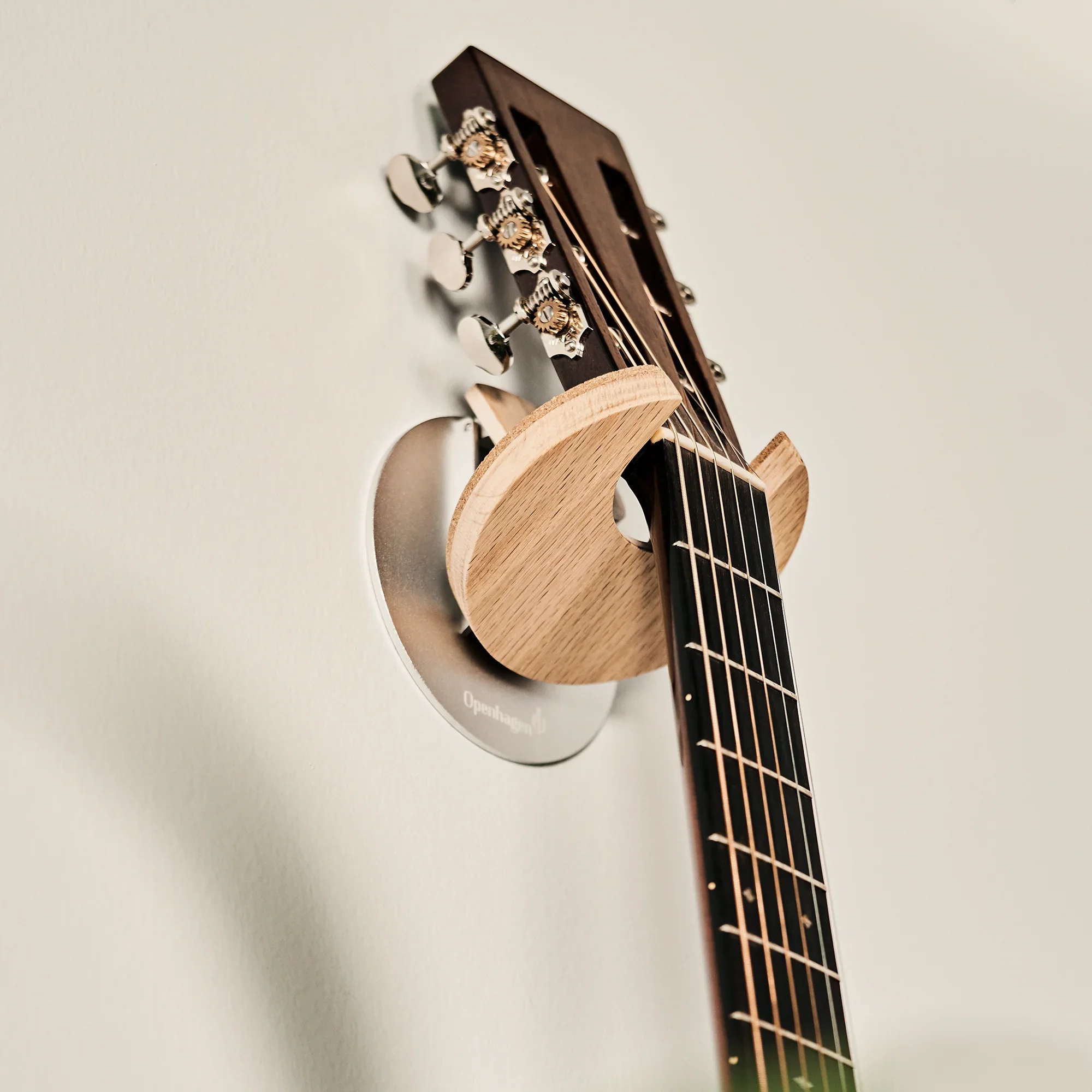 World's Only Collapsible Wall Mount HangWithMe honors your home and guitar, allowing you to display your passion in any room. Collapsible wall mount that fits most guitars and basses with an asymmetric headstock. ✓ Made of selected solid lacquered wood, anodized aluminum, and lined with oiled cork ✓ Original Danish design by the award-winning duo Harrit-Sorensen ✓ Suits Telecaster and Stratocaster-shaped headstocks the best ✓ Can be a wall decor when not in use by simply folding it up ✓ Easily mounted to the wall with 2 screws ✓ I n more than 15,000 homes ✓ Weight limit: 25 pounds ✓ 60 mm opening Specifications Length (Ø): 11 cm (4.3 in) Height: 2 cm (0.8 in) Material: Solid, oiled wood, oiled cork, anodized aluminum Special features: Collapsible, solid wood Type: For most asymmetric headstocks. Suits Telecaster and Stratocaster-shaped headstocks the best Weight: 190 - 220 g (6.7 - 7.8 oz) Designed by HarritSorensen. Manufactured by Openhagen. Patented. FAQs Q. DOES IT FIT MY INSTRUMENT? A. The wall mount fits most guitars and basses with an asymmetric (6 inline) headstock. Suits Telecaster and Stratocaster-shaped headstocks the best Q. WEIGHT LIMIT? A. The wall mount can take the heaviest bass guitars. Maximum weight 25 pounds / 11 kg. Q. WHAT’S IN THE BOX? A. 1 x instruction manual 2 x mounting screws 1 x wall mount made of solid wood with oiled cork and anodized aluminum You will receive your product in solid, eco-friendly packaging with good foam protection. Q. CARE AND MAINTENANCE? A. To clean HangWithMe please wipe with a brush or a clean towel. If you have chosen the HangWithMe with an oiled finish, please continue reading. The solid wood is treated with a waterproof and environmentally friendly wood wax oil, which is durable and long-lasting. We advise you to re-coat the wood every one or two years to maintain it. Q. DOES IT SCRATCH MY HEADSTOCK? A. HangWithMe is made of solid wood combined with oiled cork. The cork will protect your instrument from scratches or damage while hanging on the wall mount. Q. CAN I USE EG. COMMAND STRIPS? A. No you can’t. Command strips, nano/PU gel, etc. are not strong enough to hold your guitar. The wall mount is easily mounted to the wall using two screws. If you have questions, please don't hesitate to contact us: at [email protected] Shipping FREE shipping on orders above $199 . Money-back guarantee. 2-8 working days delivery. If customers provide the delivery address based on PO box addresses it will take 7-20 working days. Openhagen orders are shipped and delivered on business days (Monday - Friday - 8 AM - 5 PM). For security reasons, Openhagen will not send any order to post office boxes or military bases, nor will it accept any order when it is impossible to identify the recipient of the order and its address. If you have questions, please don't hesitate to contact us at [email protected]