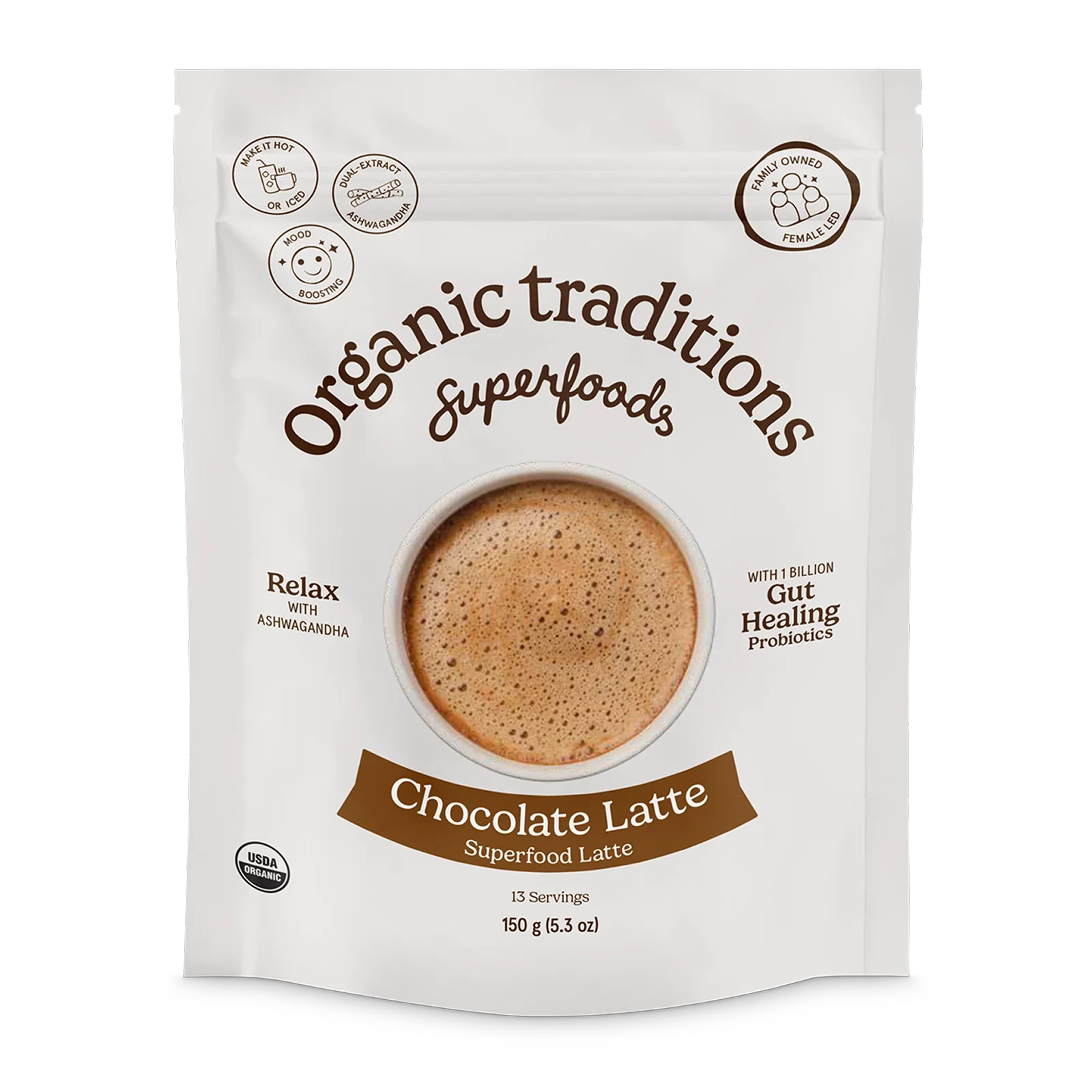 Hot chocolate, but make it functional. A delicious, organic chocolate latte with notes of warm spices, rich cacao, adaptogenic Ashwagandha, and 1 billion shelf-stable probiotics to support mood and digestion.