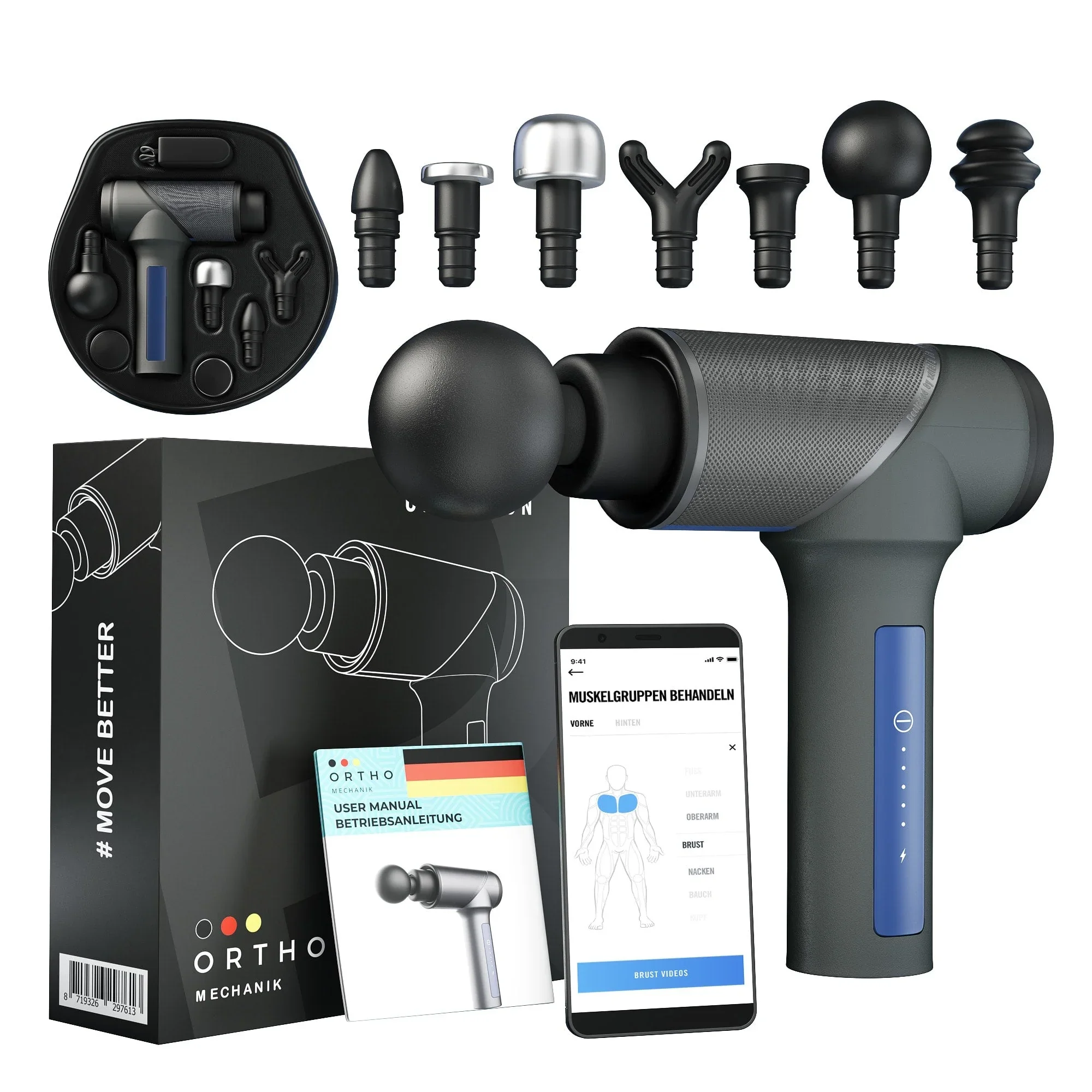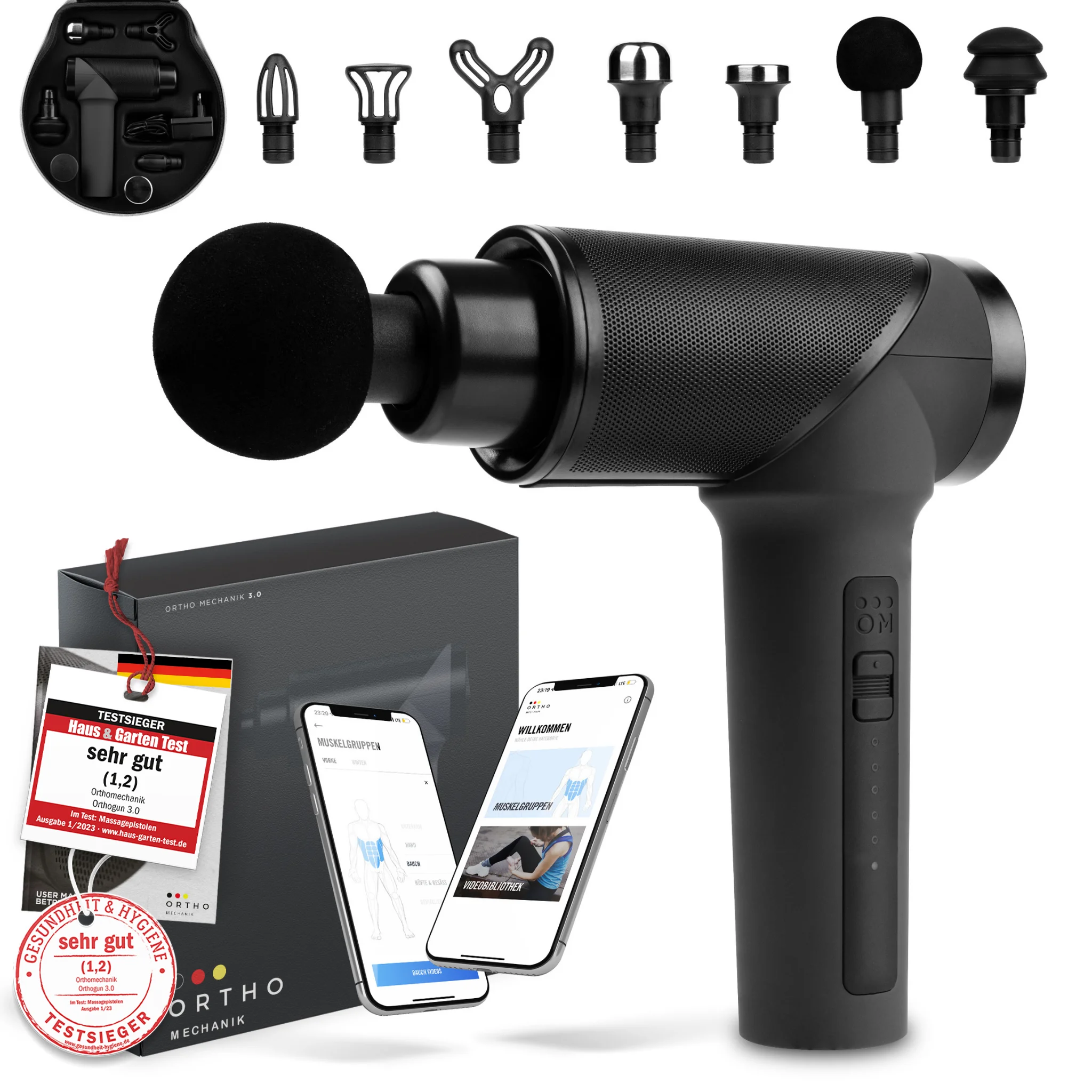 🚚 Lieferzeit 4-5 Tage (kostenlos für DE), 5-6 Tage nach Österreich. 🏅DIE MASSAGE GUN FÜR DEN PROFISPORTLER. Um Blut- und Lymphfluss zu verbessern brauchst Du ohne OrthoGun nach dem Training viel Zeit. Dies wird jetzt effizienter. Durch die hoch-frequente Druckmassage werden deine Faszien mit „frischer“ Lymphflüssigkeit versorgt, fasziale Verklebungen werden so behandelt und vorgebeugt 🏅 Leistungsstarker und leiser bürstenloser 160 Watt Motor. 5 Gänge mit bis zu 3200 Umdrehungen und einer Tiefe von 12 mm. Selbst bei zusätzlichem Druck wird der Motor nicht langsamer. 🏅 Handlich, leicht, mit Tragetasche und einer Akku Betriebszeit von 3-6 Stunden (abhängig vom gewählten Gang) ist dieser Massage Shooter der perfekte Wegbegleiter für das tägliche Training und Turniere. 🏆DIE MASSAGE PISTOLE FÜR DEN TRAINER. Erreiche messbare und sichtbare Ergebnisse für Deine Kunden. Stimuliere fasziales Gewebe um Verspannungen und Steifheit zu lösen, und Schmerzen zu lindern. 🏆 6 Aufsätze, davon 2 Metallaufsätze, welche leicht zu reinigen und zur hygienischen Wiederverwendung, auch mit Massageölen geeignet sind. Durch das schnelle Aufladen der Faszien Pistole, ist deine OrthoGun innerhalb von 30 Minuten wieder einsatzbereit. 🛡️30 Tage Geld zurück Garantie. 2 Jahre Garantie , bei Defekt schicken wir Dir umgehend ein neues Gerät . 🧍Erfahrungsberichte: Nadine Apetz (Profiboxerin, ️2016 World 🥉 ) Sebastian Trimborn (Vize-Europameister 24h MTB 2019) Kamil (Coach und Kampfsportler) Volker Auler ( Chiropraktiker, Heilpraktiker und Physiotherapeut) Nadine (Hobby Sportlerin) Nic (Leistungssportler) Coach Stef (Personal Trainer - Physiotherapeut) Robin und Nico (Bodybuilder und Sportler) Erfahrungsberichte und Video Unser Blog "Alles was Sie über Massagepistolen wissen sollten"