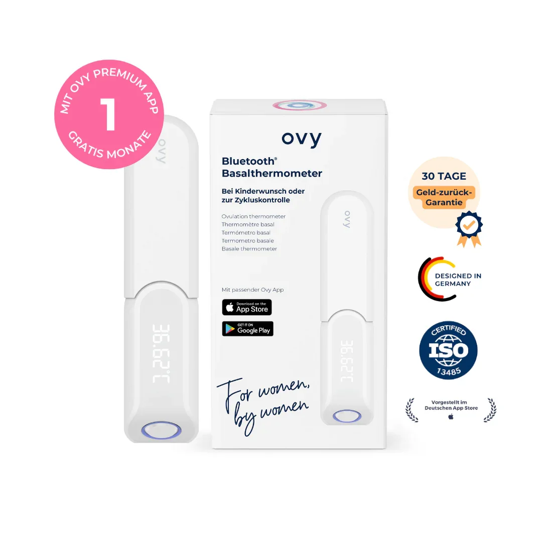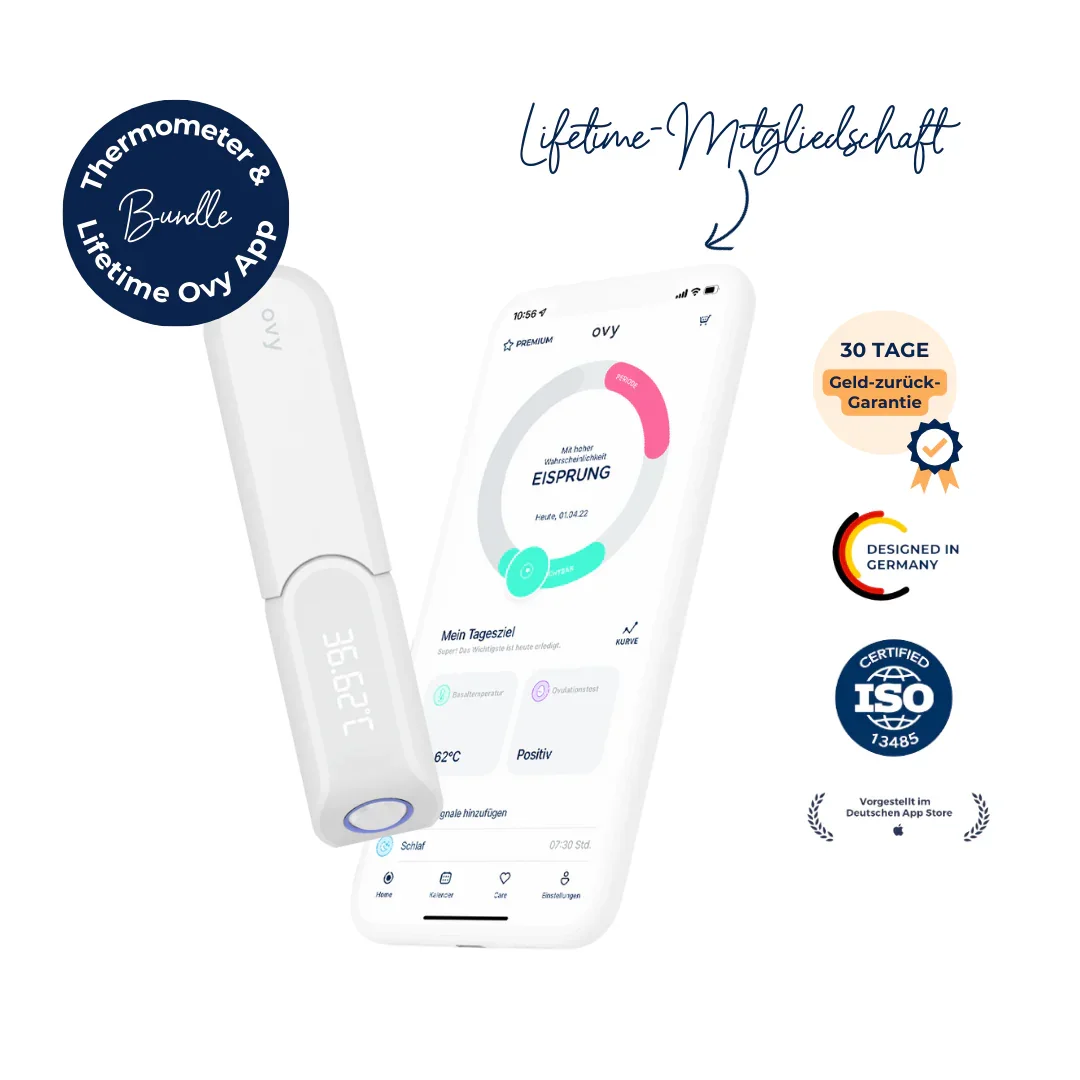 ✓ Wir bieten dir für kurze Zeit eine Lifetime-Mitgliedschaft der Ovy Premium App an inklusive des beliebten Ovy Bluetooth Basalthermometer ! ✓ Zur täglichen Messung der Körperkerntemperatur - direkt nach dem Aufwachen. ✓ In Kombination mit der Ovy App – zur natürlichen Verhütung oder bei Kinderwunsch einsetzbar. ✓ Automatische Datenübertragung – vermeidet Eingabefehler und speichert deine Werte zuverlässig. ✓ Im Verhütungsmodus der Ovy App : Bestimme deine fruchtbaren und nicht fruchtbaren Tage auf Basis deiner Temperatur, der letzten Periode und Zervixschleimqualität. ✓ Im Kinderwunschmodus der Ovy App : Bestimme deinen Eisprung, die fruchtbaren Tage und den Zeitpunkt deiner nächsten Periode – unterstützt durch Temperaturdaten, Zervixschleimqualität, Zeitpunkt der Periode und Ovulationstests . ✓ Erhalte eine Erinnerung für den bestmöglichen Zeitpunkt, einen Schwangerschaftstest durchzuführen. ✓ Nach Erwerb der Mitgliedschaft kannst du die Ovy Premium App unbegrenzt nutzen inkl. aller Feature Updates, die in Zukunft folgen. Wichtig: Bitte v erwende beim Check-out die gleiche E-Mail-Adresse, mit der du dich in der Ovy App registrieren wirst! Falls du bereits ein Ovy App Konto besitzt, verwende beim Check-out die registrierte E-Mail-Adresse.