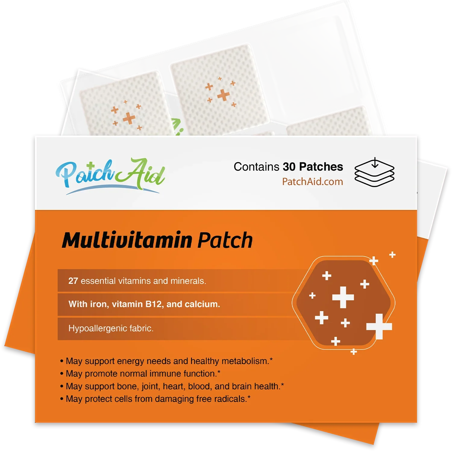 Your body needs certain nutrients to survive and thrive. You may be careful to eat right and choose nutritious foods, but are you sure you are getting your ideal amount of each of the essential vitamins and minerals your body needs each day? The goals are not only to prevent deficiencies but also to get optimum amounts for your well-being. Our Multivitamin Plus Topical Vitamin Patch has a unique formula with 27 essential vitamins and minerals. The vitamin patch is designed to contain nutrients that may not be high enough in your daily diet to provide you with optimal amounts. Multivitamin Plus Topical Vitamin Patch by PatchAid: M ay provide essential nutrients that are not present each day.* M ay support healthy metabolism and energy production.* M ay support a strong immune system.* M ay support bone, joint, heart, blood, and brain health.* M ay protect healthy cells from damaging free radicals.* A multivitamin supplement can take the daily pressure off of getting each of the nutrients you need. Multivitamin Plus Topical Vitamin Patch by PatchAid offers: 27 essential vitamins and minerals in each vitamin patch. A stress-free way of getting essential nutrients. No worries about upset stomach due to nutrient absorption. PatchAid Vitamin Patch Difference At PatchAid, we support total health. We see the human body as the complex, interactive system that it is, with ever-changing components that affect each other. You can see this holistic philosophy reflected in our vitamin patches when you see that PatchAid vitamin patches contain more nutrients per vitamin patch than other vitamin patch brands. Another PatchAid vitamin patch difference is the value we deliver to our customers. Our vitamin patches come with clear backing for a clear reason: it works. Other vitamin patch brands come with a white paper backing that can stick to the patch and damage the vitamin patch when you try to peel off the backing. Our vitamin patches come with a clear backing designed specifically to make sure every multivitamin patch is usable, every time. To Use Vitamin Patch: Select an area of skin. The vitamin patch will stick better if you choose an area of skin without hair, lotion, or oil residues such as your shoulder, back, or hip . Clean and dry the skin. Remove the multivitamin patch from the release liner. Adhere the vitamin patch to your skin, pressing firmly. For best results, it is recommended to wear PatchAid vitamin patches for 8 hours. There is no additional benefit of wearing the multivitamin patch longer than 8 hours. When finished, remove the vitamin patch, fold it in half, and discard. Repeat with a new multivitamin patch the next day. It is ok to wear multiple PatchAid vitamin patches at a time. PatchAid Multivitamin patches are Latex, Lactose, Gluten, and Sugar-free. Please see our Frequently Asked Question s for answers to commonly asked questions about our PatchAid vitamin patches. As with any dietary supplement, please consult a healthcare professional before using this product. Women who are pregnant or nursing and individuals with health conditions or on medications should be especially careful before using the supplement. Please Note: Nutritional vitamin patches are a new technology. As with any nutritional supplements, consumers should use nutrition patches according to their healthcare providers' recommendations and regularly monitor nutrient levels through lab work as they would when taking any dietary supplements. The Food and Drug Administration has not evaluated these statements. The Multivitamin Plus Topical Patch by PatchAid is not intended to diagnose, treat, cure or prevent any disease. Anyone with a medical condition should seek the advice of a licensed medical practitioner. Individual results may vary. All vitamin patches are free of Artificial Dyes, Casein, Corn, Colors, Dairy, eggs, Fillers, Flavorings, Gluten, GMO’s, Latex, MSG, Peanuts, Preservatives, Shellfish, Soy, Sugar, Tree Nuts, and Wheat.