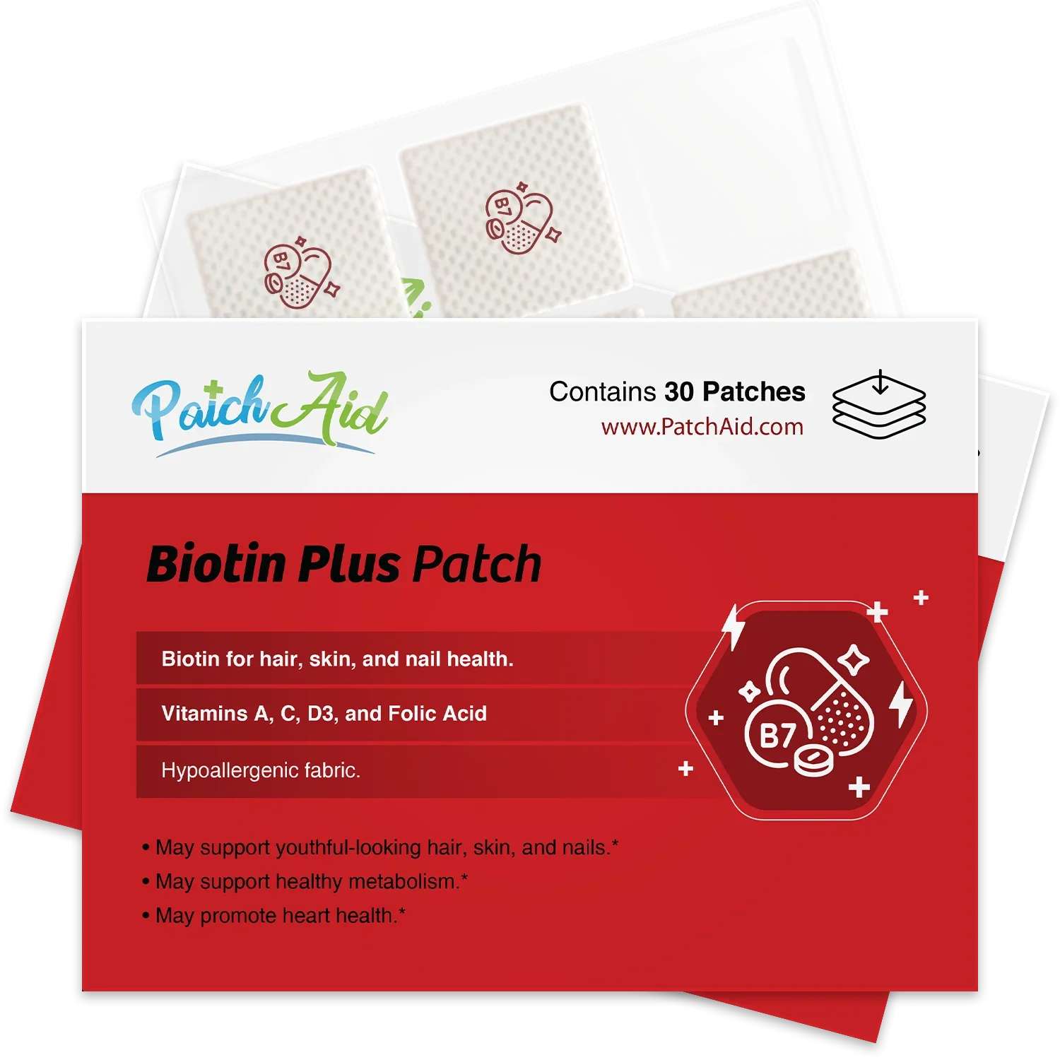 Biotin is a B vitamin that you need for healthy hair and skin. It is often overlooked, but biotin is also necessary for energy production from carbohydrates. PatchAid Biotin Plus Vitamin Patch: May support youthful-looking hair, skin, and nails.* May support a healthy metabolism.* May promote heart health.* PatchAid Biotin Plus Vitamin Patch offers: Vitamins A and C – two antioxidant vitamins. Folate – the “leafy dark green” vitamin. Vitamin D3 – the “sunshine” vitamin. PatchAid Biotin Vitamin Patch Difference At PatchAid vitamin patches, we support total health. We see the human body as the complex, interactive system that it is, with ever-changing components that affect each other. You can see this holistic philosophy reflected in our biotin vitamin patches when you see that PatchAid biotin patches contain more nutrients per biotin patch than other brands. Another PatchAid vitamin patch difference is the value we deliver to our customers. Our biotin vitamin patches come with clear backing for a clear reason: it works. Other biotin vitamin patch brands come with a white paper backing that can stick to the biotin patch and damage the biotin patch when you try to peel off the backing. Our biotin vitamin patches come with a clear backing designed specifically to make sure every biotin vitamin patch is usable, every time. To Use Biotin Vitamin Patch: Select an area of skin. The vitamin patch will stick better if you choose an area of skin without hair, lotion, or oil residues such as your shoulder, back, or hip . Clean and dry the skin. Remove the vitamin patch from the release liner. Adhere the vitamin patch to your skin, pressing firmly. For best results, it is recommended to wear PatchAid vitamin patches for 8 hours. There is no additional benefit wearing the vitamin patch longer than 8 hours. When finished, remove the vitamin patch, fold it in half, and discard. Repeat with a new vitamin patch the next day. It is ok to wear multiple PatchAid vitamin patches at a time. PatchAid biotin vitamin patches are Latex, Lactose, Gluten, and Sugar-free. Please see our Frequently Asked Questions for answers to commonly asked questions about our PatchAid vitamin patches. As with any dietary supplement, please consult a healthcare professional before using this product. Women who are pregnant or nursing and individuals with health conditions or on medications should be especially careful before using the supplement. Please Note: Nutritional vitamin patches are a new technology. As with any nutritional supplements, consumers should use nutrition patches according to their healthcare providers' recommendations and regularly monitor nutrient levels through lab work as they would when taking any dietary supplements. The Food and Drug Administration has not evaluated these statements. The Biotin Plus Vitamin Patch for Hair, Skin, and Nails by PatchAid is not intended to diagnose, treat, cure or prevent any disease. Anyone with a medical condition should seek the advice of a licensed medical practitioner. Individual results may vary. All biotin vitamin patches are free of Artificial Dyes, Casein, Corn, Colors, Dairy, eggs, Fillers, Flavorings, Gluten, GMO’s, Latex, MSG, Peanuts, Preservatives, Shellfish, Soy, Sugar, Tree Nuts, and Wheat.