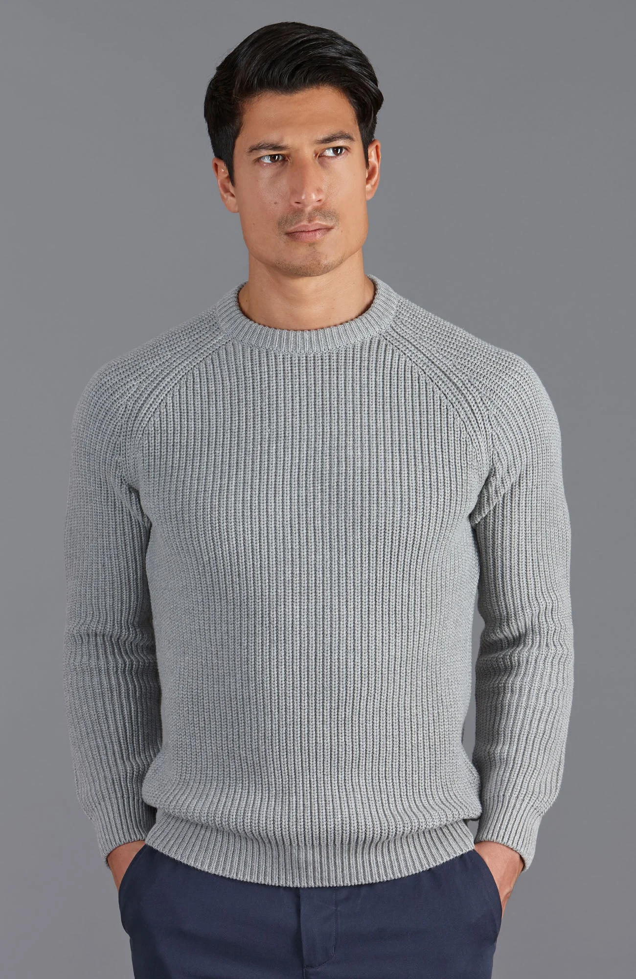Ribbed Chunky 100% Cotton Fisherman's Sweater A classic in every sense of the word, our Clarke half cardigan stitch jumper is made from pure cotton, meaning its comfortable, stylish and easily workable into any outfit. Finished with a raglan sleeve and intricate shoulder stitch detail, this style is a wardrobe essential. Cotton does not pill, so it's a sturdy choice for those outdoor pursuits. View more fisherman jumpers Model wears Black & Navy - Chan is 6ft (182cm), chest size 40" (101cm) and wears medium for a fitted look Anthracite & Ecru - Freddie is 6ft 1" (185cm), chest size 40" (98cm) and wears medium for a regular fit Ash Grey, Blue Melange, Ecru, Grey Nepp & Linen - George is 6ft 2" (188cm), chest size 38" (96cm) and wears medium for a regular fit Product Summary Round neck heavyweight sweater True to size 100% cotton Half cardigan stitch jumper Ideal for unpredictable mild days Machine washable Breathable natural fibre skin-friendly knitwear Made in our factory in India Free UK delivery on orders of £50 or more The benefits of wearing 100% cotton knitwear Comfortable, breathable, and cool to skin Transmits moisture away from the skin Durable, pill-free, and machine washable Skin-friendly itch-free knitwear Sustainable and biodegradable clothing choice