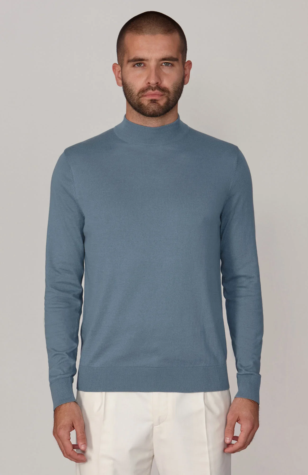 High Neck 100% Cotton Long Sleeve Sweater A modern classic, our Spencer mock turtleneck or grown on neck jumper is made from an ultra-lightweight cotton knit. Simple to style and to dress up and down, this is your cool layer for the warmer months, or a fine base layer to any of our chunky roll neck jumpers. Styled with our Knitted Jackets View more mock, roll and turtle neck jumpers Model wears Bluestone, Blue Melange, Chalk Blue, Ecru, Fawn, Navy & White - Chan is 6ft (182cm), chest size 40" (101cm) and wears medium for a fitted look Anthracite, Ash Grey, Black, Tobacco - George is 6ft 2", chest size 38" and wears medium for a regular fit Product Summary 100% cotton mock turtleneck sweater Made from ultra fine, breathable cotton for natural comfort and easy layering Intricate French shoulder design for a seamless front-body appearance True-to-size, contemporary fit Ribbed hem and cuffs for structure and lasting shape Machine washable Expertly crafted in our factory in India using precision Japanese knitting technology Wash care Machine washable | Dry flat | Do not tumble dry Apply a warm iron on a gentle steam setting to finish Benefits of Wearing 100% Cotton Knitwear Breathable and Cool : Cotton is perfect for layering, as it prevents overheating while still providing warmth. Durable and Pill-Free : Designed to last, our cotton knitwear resists pilling, maintaining its appearance wash after wash. Moisture-Wicking : Cotton naturally wicks moisture away from the skin, keeping you comfortable throughout the day. Machine Washable and Easy Care : These blazers are easy to care for, and they maintain their shape and softness after each wash. Sustainable and Biodegradable : Made from 100% natural cotton, our knitwear is an eco-friendly, biodegradable choice.
