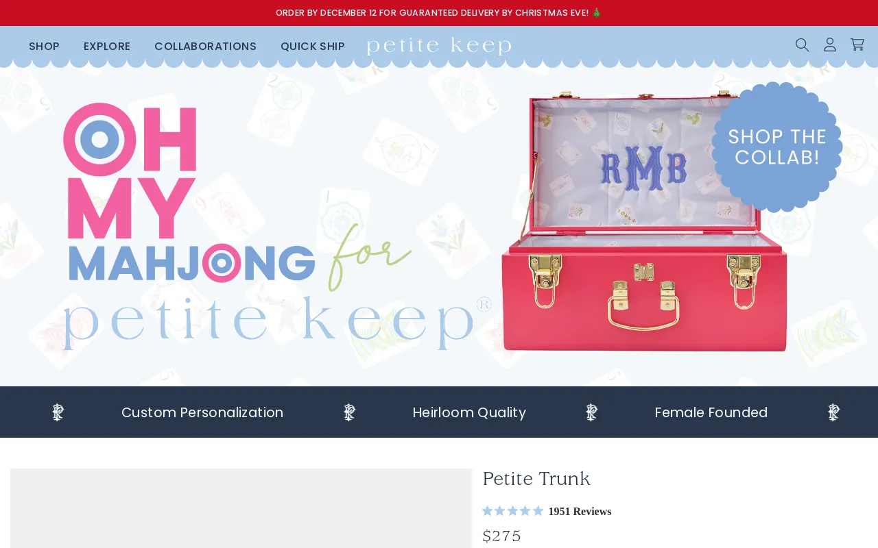 Your Story, Safekept for Generations Safeguard your most cherished memories with a Petite Keep custom heirloom Trunk, personalized and hand-crafted to last a lifetime. Product Details Our medium-sized Trunk: Measurements: 20.4″ L × 10.2″ W × 7.8″ H Materials: Robust matte-finish steel exterior with elegant gold hardware; fully lined with a padded, soft fabric interior. Designed to be lightweight and decorative rather than heavy duty. Embroidery: Size varies slightly depending on character count. Turnaround Time Crafted with pride in Missouri: Please allow 2 weeks for hand assembly plus 2-3 days for shipping and delivery. Ships securely packaged with reinforced corner protection. Each Trunk is inspected prior to shipment. Designed to Protect, Personalize, and Display Heirloom-Quality Protection: Designed to pass down through generations, ensuring your family's history remains vibrant! Deeply Personal & Meaningful: Envision "Ellie Rose 2.20.25" or "Forever Starts Here" embroidered onto your Petite Keep! American Craftsmanship: Each Petite Keepsake Trunk is proudly made-to-order in the U.S. by our skilled, all-woman team. Designed to Display: Add a touch of sophisticated charm to your space while keeping your memories close at hand!