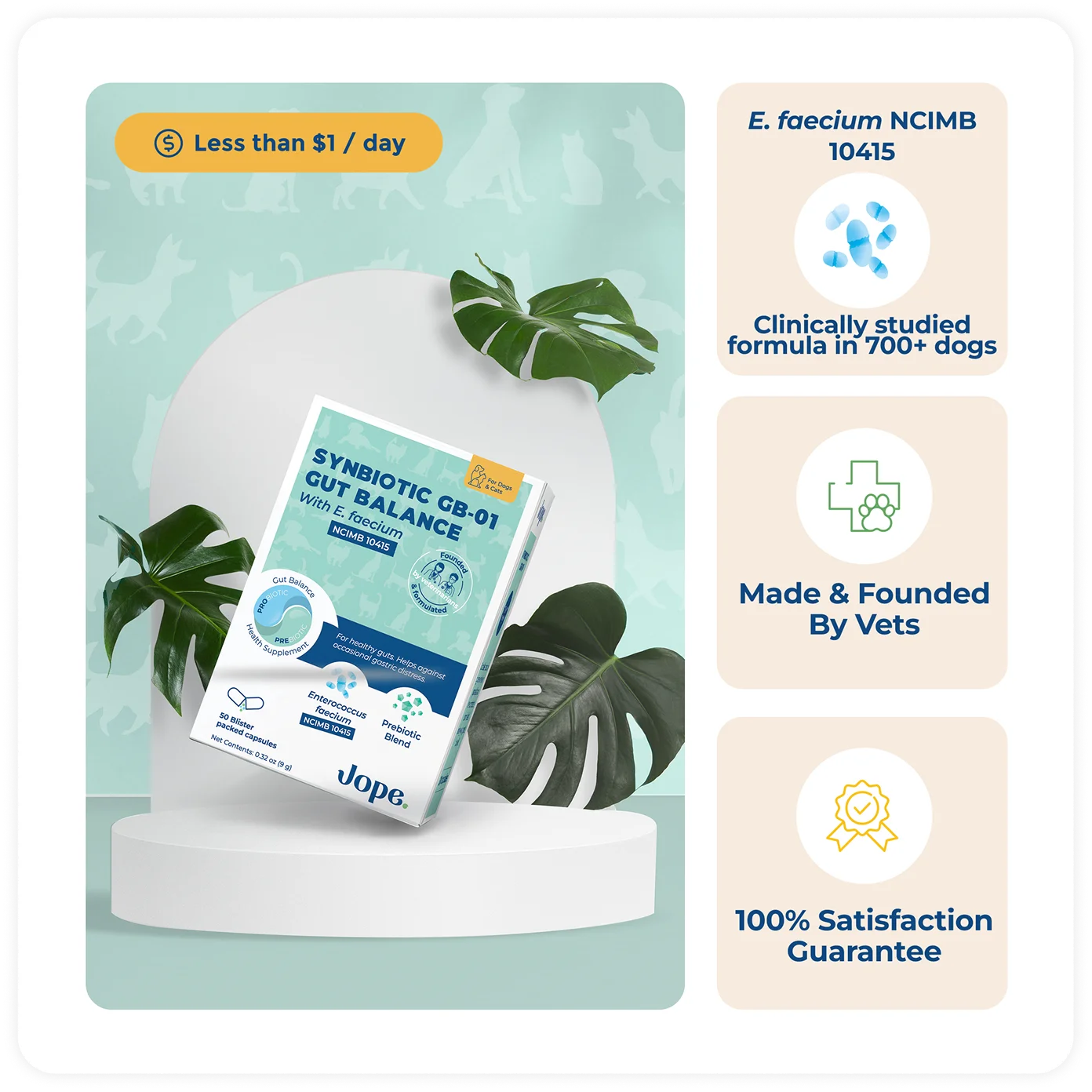 Free Shipping & 100% satisfaction guarantee Free Shipping & 100% satisfaction guarantee $5 4.90 $59.90 🛡️ First results in 3 weeks 🧬 Harness the power of UC-II® collagen ⭐ 59% greater efficacy than glucosamine and chondroitin 🐟 High dose of Omega-3 and Curcumin 👨⚕️Made by veterinarians 🌿Organic ingredients & cold pressed chews Promote healthy joints Improve flexibility Support mobility Free shipping Secure payment 100% satisfaction guarantee Ingredients Active ingredients mg per chew UC-II® 20 mg Omega-3 (Fish Oil) 200 mg EPA 59 mg DHA 39 mg Curcumin 50 mg Other ingredients: Cassava Flour* Coconut Glycerin* Fish Oil (Anchovies) Flaxseed Meal Mixed Tocopherols (Vit E) Natural Chicken Flavor* Silica Soy Lecithin* Vinegar* *organic ingredients Directions Dogs under 25 lbs : give 1 chew daily Dogs between 25 & 75 lbs : give 2 chews daily Dogs over 75 lbs : give 3 chews daily Start Changing Your Dog's Life in Just 3 Weeks! Change you can see. 3 weeks - Improved mobility and comfort on walks 2 months - Reduced pain and limping as confirmed by vet evaluations 3 months - Achieve optimal joint health with daily use Support your dog's joint health for the long-term with Jope. Transform Your Dog's Life in Just 3 Weeks! Change you can see. 3 weeks - Improved mobility and comfort on walks 2 months - Reduced pain and limping as confirmed by vet evaluations 3 months - Achieve optimal joint health with daily use Support your dog's joint health for the long-term with Jope. 100% satisfaction or your money back! Pure and Potent: The Best Ingredients for Optimal Joint Health Elevate your dog's joint health with the power of simplicity and efficacy. Our veterinarian-formulated chews are packed with only the most effective ingredients, supported by science, and trusted by the veterinarian community. Say goodbye to unnecessary ingredients and hello to results.* *See the public studies, available on our website. This Collagen Revolutionize Your Dog's Joint Health 59% superior joint health improvement over glucosamine/chondroitin 81% improvement in joint mobility and pain reduction Proven effective through independent clinical trials for joint issues Proven Relief From Inflammation With Omega-3 200mg EPA & DHA per chew, 2-4x more than other supplements Clinically proven for joint health, recommended by vet surgeons Shown effective for post-surgery, dysplasia and arthr Nature's Best Anti-Inflammatory & Antioxidant 50mg pure curcumin for rapid and effective results Targets specific inflammation pathway for joint aches relief Optimizes joint health with UC-II ® and omega-3 synergy Pure and Potent: The Best Ingredients for Optimal Joint Health Elevate your dog's joint health with the power of simplicity and efficacy. Our veterinarian-formulated chews are packed with only the most effective ingredients, supported by science, and trusted by the veterinarian community. Say goodbye to unnecessary ingredients and hello to results.* *See the public studies, available on our website. This Collagen Revolutionize Your Dog's Joint Health 59% superior joint health improvement over glucosamine/chondroitin 81% improvement in joint mobility and pain reduction Proven effective through independent clinical trials for joint issues Proven Relief From Inflammation With Omega-3 200mg EPA & DHA per chew, 2-4x more than other supplements Clinically proven for joint health, recommended by vet surgeons Shown effective for post-surgery and dysplasia Nature's Best Anti-Inflammatory & Antioxidant 50mg pure curcumin for rapid and effective results Targets specific inflammation pathway for joint aches relief Optimizes joint health with UC-II ® and omega-3 synergy Founded by Veterinarians As veterinarians, we always strive to help dogs and cats live long, happy, healthy lives. When our beloved dog Pepsi was diagnosed with severe joint problems, we were determined to find a solution. We discovered a groundbreaking ingredient: undenatured type II collagen (UC-II®). Through formula testing and iteration, we found three effective active ingredients: UC-II® to protect cartilage. Omega-3 to decrease inflammation. Curcumin for antioxidant support. Our commitment to helping dogs live active lives led us to create a veterinary wellness company and offer veterinary-quality dog supplements. We appreciate your trust in helping your dog achieve a long and healthy life. Drs. Christine and Jeremy, Veterinarians and co-founders of Jope 85+ studies reviewed to choose our ingredients 15+ years of veterinary experience 3 continents we worked in USA, Europe & Australia Vet-Created: Proven Joint Health Solution Unlike common hip and joint supplements, Jope's active ingredients have been clinically shown to reduce pain and increase joint strength in dogs. In contrast, chondroitin, glucosamine, and MSM have similar effects to placebo. Jope is Trusted by Leading Veterinarians! "After reading studies about UC-II®, I decided to try Jope Hip & Joint Dog Chews on my own 11-year-old Havane. I must admit I didn't expect such visible results so fast." Dr Giraud DVM, ECVIM, Internal Medicine Specialist "I regularly recommend Jope Hip & Joint Dog Chews after surgeries or on dogs with hip dysplasia. It’s simply the best formula among the supplements on the market." Dr Giansetto DVM, ECVS, Veterinary Surgeon "The dogs in our office love to eat Jope Hip & Joint Dog Chews like a treat, not knowing how good they are for them!" Dr Cadieu DVM, Generalist Founded by Veterinarians As veterinarians, we always strive to help dogs and cats live long, happy, healthy lives. When our beloved dog Pepsi was diagnosed with severe joint problems, we were determined to find a solution. We discovered a groundbreaking ingredient: undenatured type II collagen (UC-II®). Through formula testing and iteration, we found three effective active ingredients: UC-II® to protect cartilage. Omega-3 to decrease inflammation. Curcumin for antioxidant support. Our commitment to he