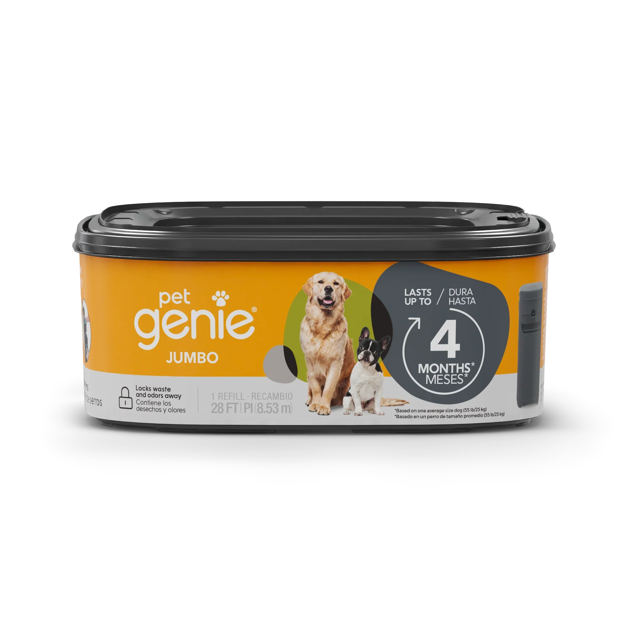 The Pet Genie Jumbo Refill offers 28 feet of bags and that can last up to 4 months for one medium dog.