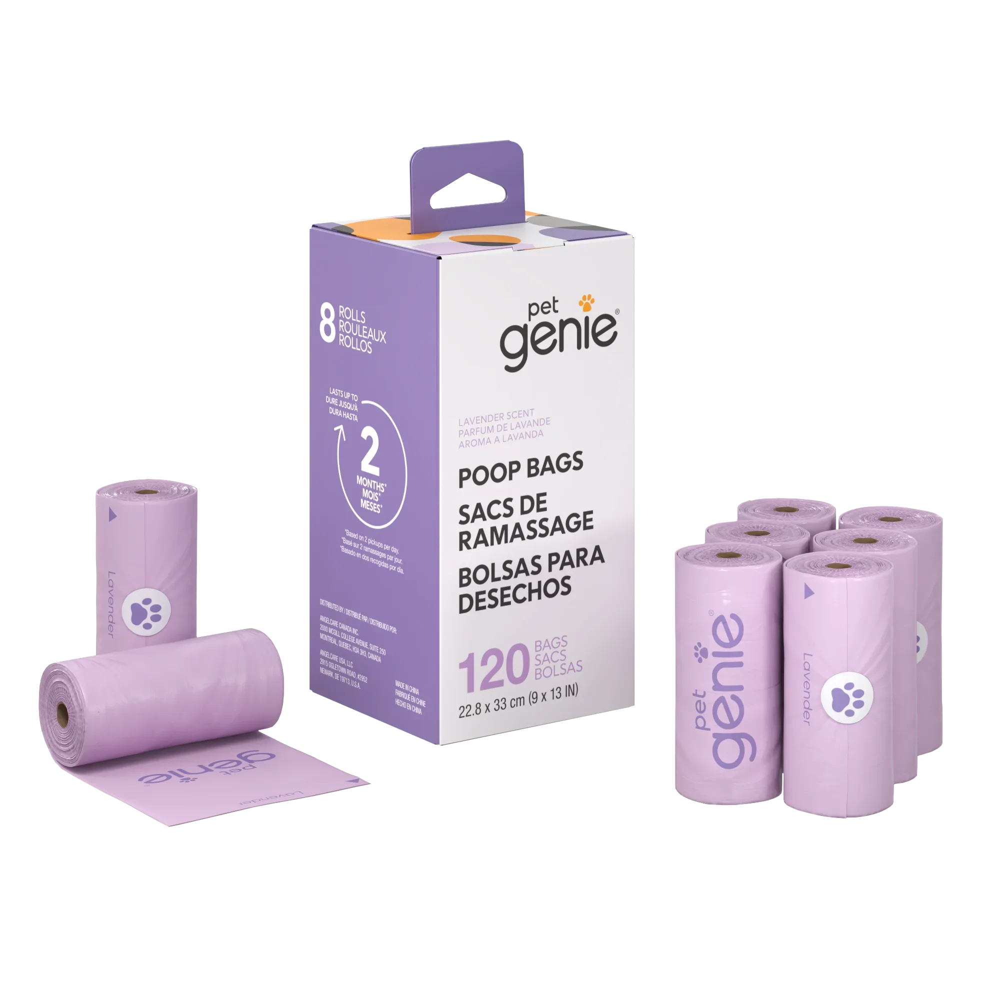The Pet Genie Poop Bags for dogs are lavender-scented, leak-proof, and made with 65% recycled plastic.