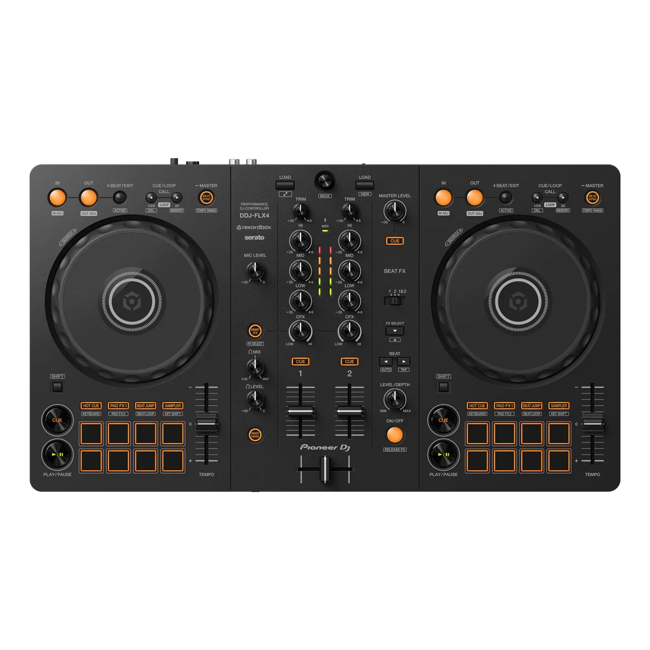 The DDJ-FLX4 is a 2-channel controller with a simple, user-friendly design and a professional feel.