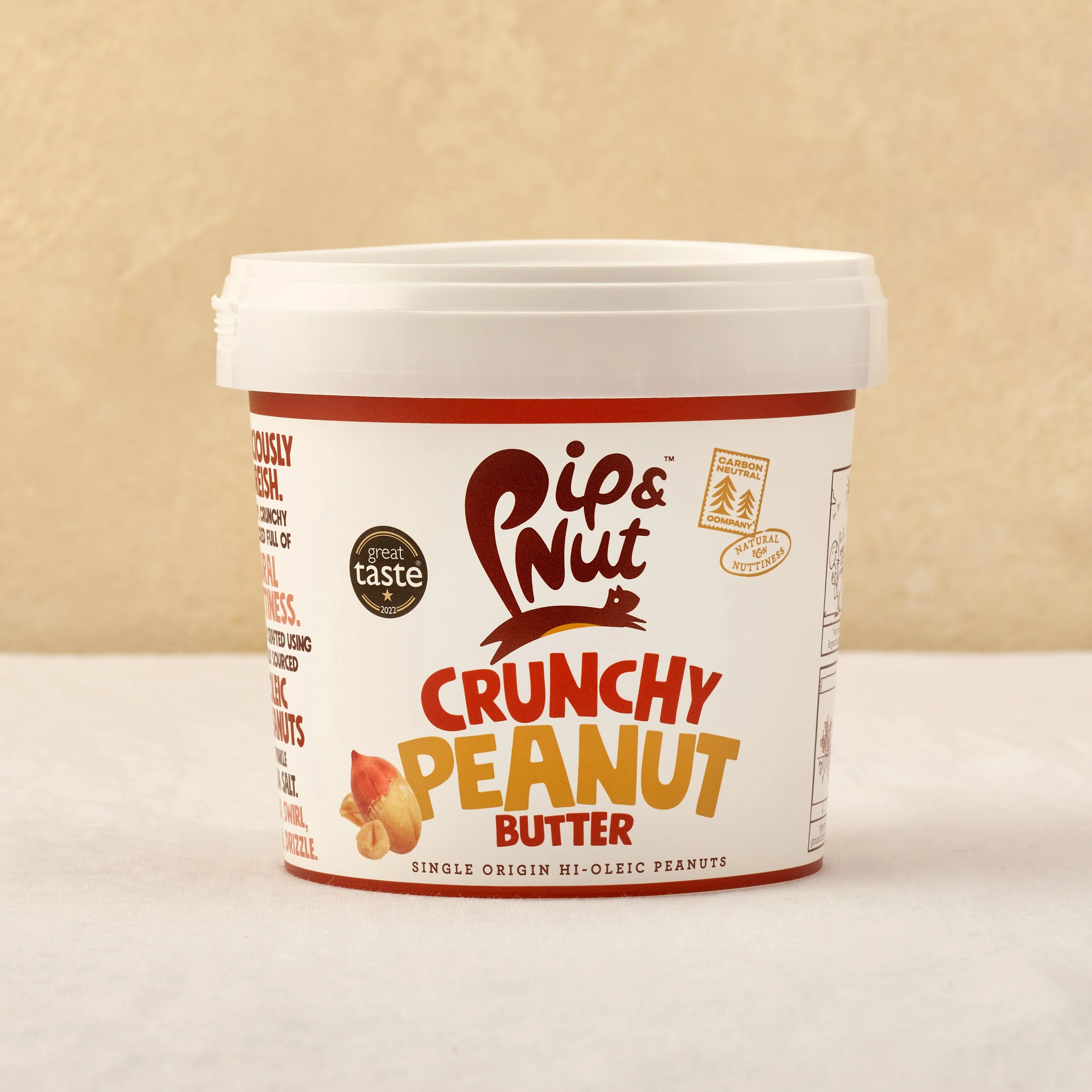 What is it? The OG PB. It's a classic, & we don't mess with the classics. Packed with flavour, not unecessary extras (looking at you palm oil), we keep it natural. Our Crunchy Peanut Butter is made with just two ingredients: hi-oleic peanuts (99.4%) & a sprinkle of sea salt. Crunchy & creamy, not clumpy or gritty. We know good peanut butter, and so do you. Dig in. What can I use it for? For all you crunchy operators this is our 1kg tub, the biggest it gets: add a little crunch to your toast, sandwich, porridge, crackers, cookies, bananas, apples… The world's your peanut. || Best bits: Just two ingredients: peanuts (99.4%) & a sprinkle of sea salt. We're picky about peanuts. These are the best we can get our paws on: naturally sweet, single-origin, hi-oleic peanuts from Argentina. No palm oil. Ever. High in mono-unsaturated fats (the good kind you find in olive oil & avocados*) No added sugar.** High in fibre. Source of protein. Plant based. *Replacing saturated fats in the diet with unsaturated fats contributes to the maintenance of normal blood cholesterol levels. **Contains naturally occurring sugars.