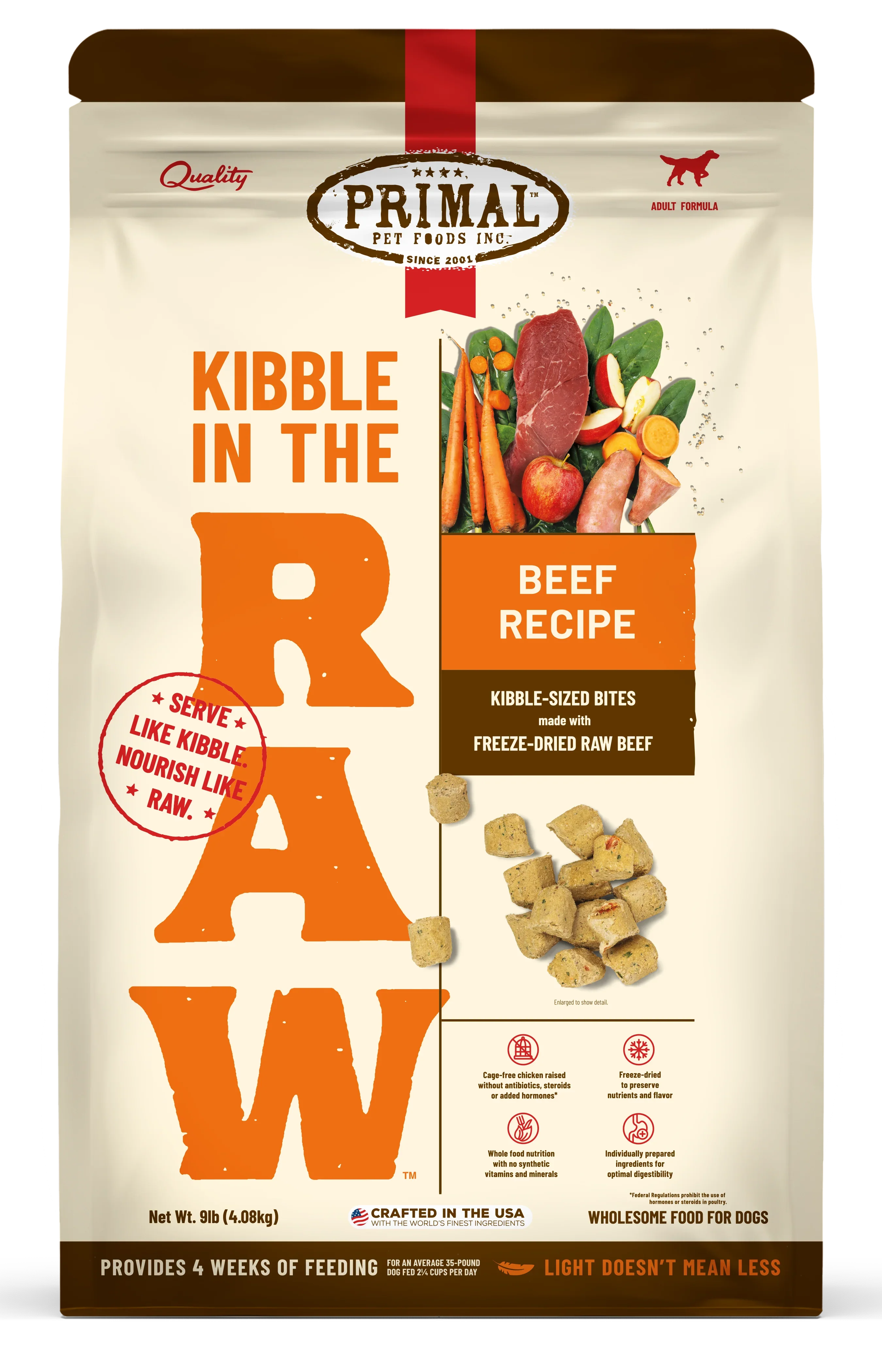 Made with grass-fed beef Freeze-dried and minimally processed to preserve vital nutrients Crafted entirely of freeze-dried bites for optimized nutrition with scoop-and-serve convenience Backed by peer-reviewed research to be more digestible and support a healthier gut compared to foods cooked at high heat Lightweight and more nutrient dense than traditional kibble Whole food nutrition with no synthetic vitamins or minerals We're refreshing our packaging and you may see both packages in-store as we transition. You can read more about the transition in our FAQs.